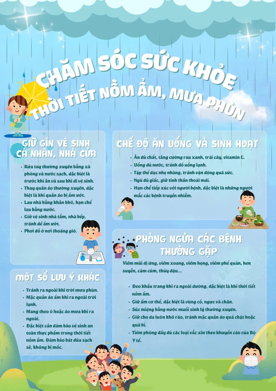 Hiện nay, miền Bắc đang bước vào giai đoạn mưa phùn, nồm ẩm kéo dài. Đây là điều kiện thuận lợi để các loại virus, vi khuẩn phát triển làm tăng nguy cơ mắc các bệnh về đường hô hấp, tiêu hóa, các bệnh về da… Để phòng, chống một số bệnh thường gặp khi thời tiết nồm ẩm, trường Mẫu giáo Số 5 rất mong các bậc CMHS thường xuyên phối hợp đảm bảo môi trường xung quanh sạch sẽ, khô thoáng. Cha mẹ hướng dẫn các con giữ gìn vệ sinh cá nhân để phòng bệnh thật tốt. CMHS có thể tham khảo một số cách chăm sóc sức khoẻ khi thời tiết nồm ẩm, mưa phùn như các biện pháp dưới đây
