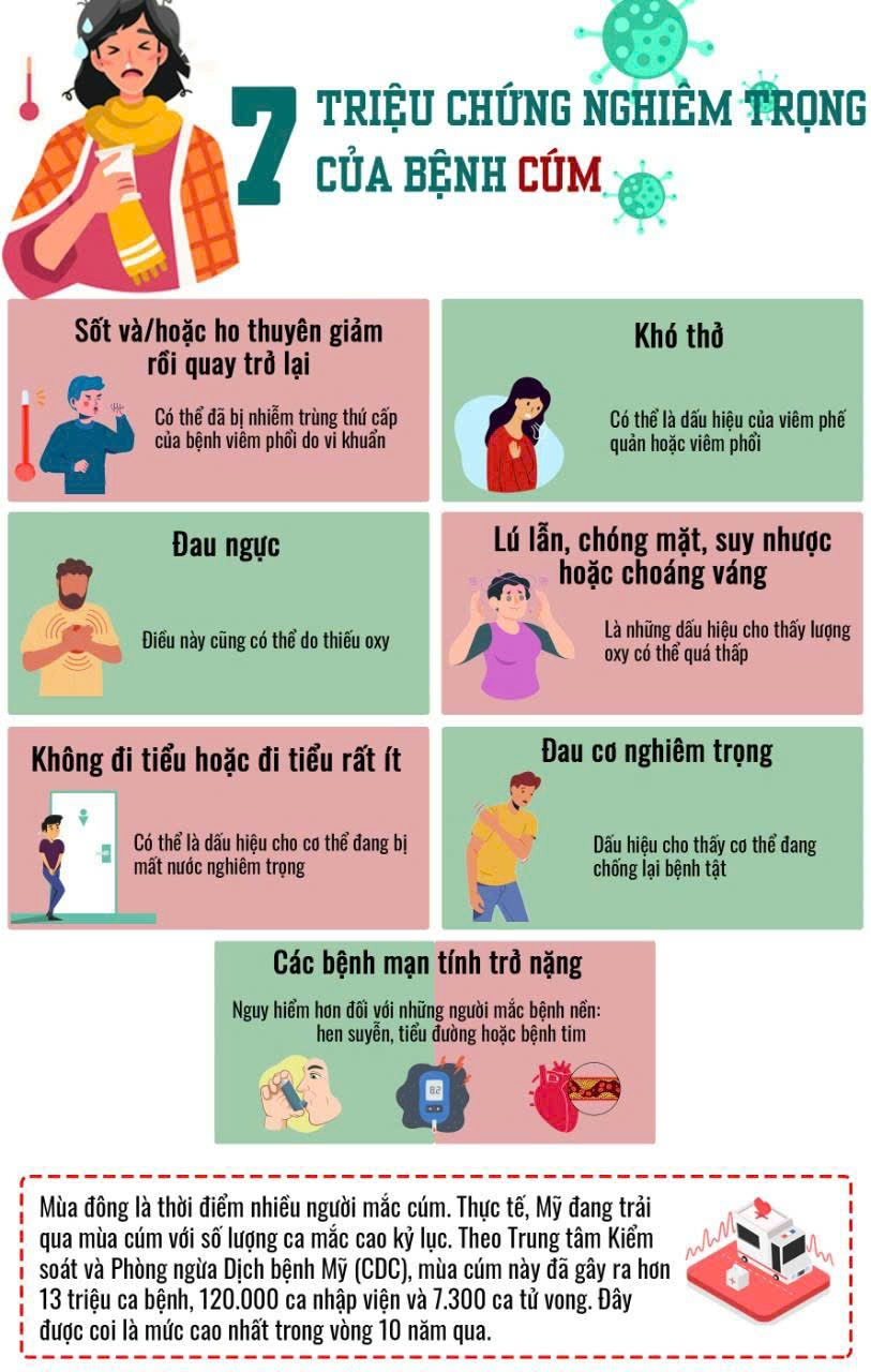 Bộ Y tế khuyến cáo, những người có bệnh lý nền cần hết sức lưu ý, khi có biểu hiện sốt, đau rát họng, hắt hơi, sổ mũi nên được đi khám sàng lọc cúm và đánh giá và cân nhắc cho dùng thuốc kháng virus cúm sớm để ngăn ngừa nguy cơ nhiễm cúm nặng. Nếu để đến lúc nặng rồi mới đi viện khám, điều trị tốn kém và khó khăn.