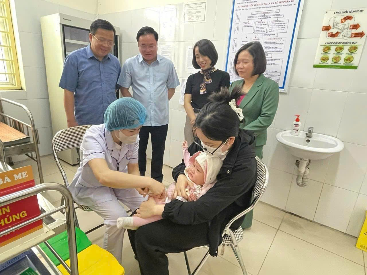 Giám sát công tác tiêm vắc xin phòng bệnh sởi trên địa bàn quận Long Biên. Ảnh: N.Dung