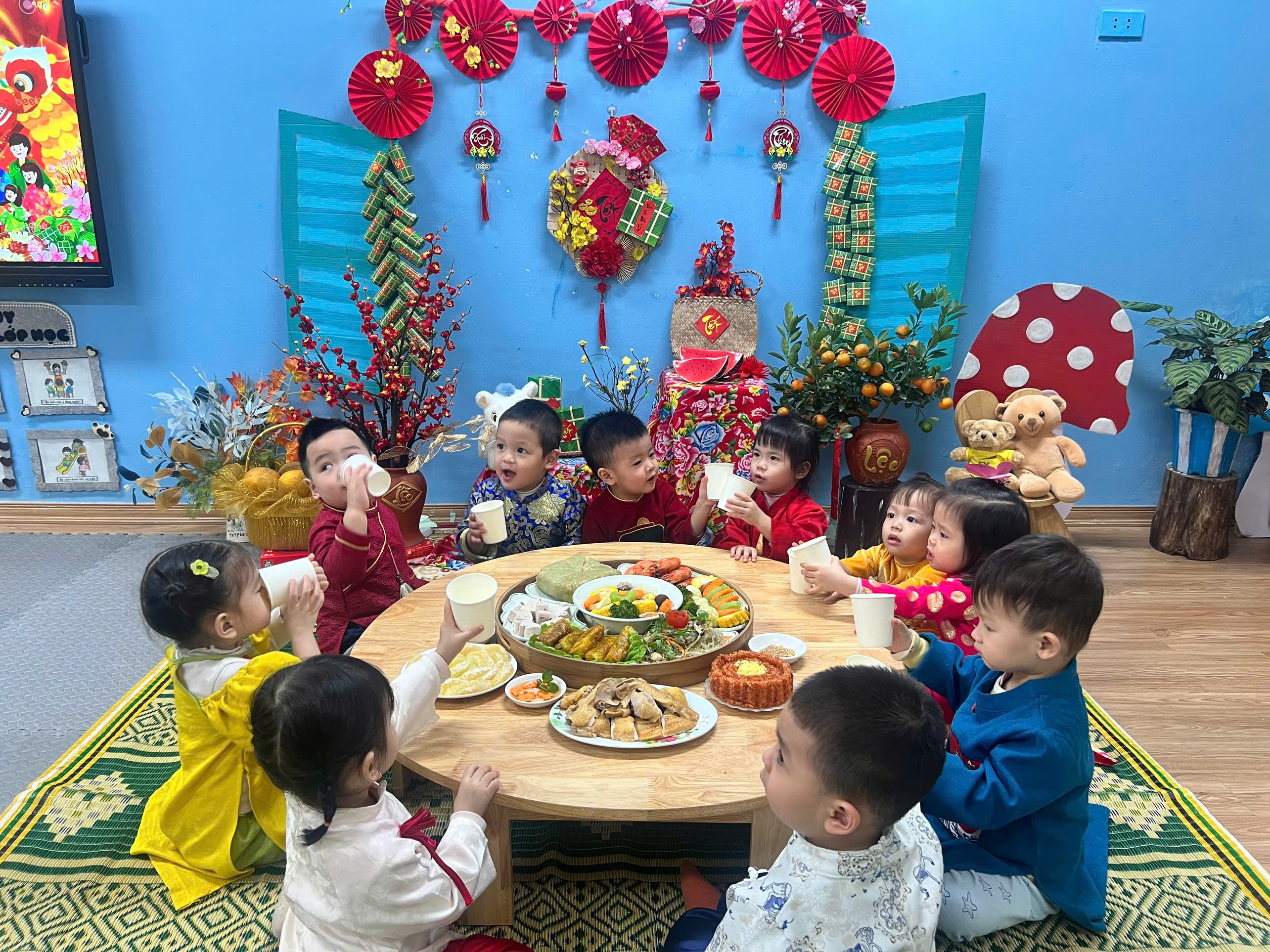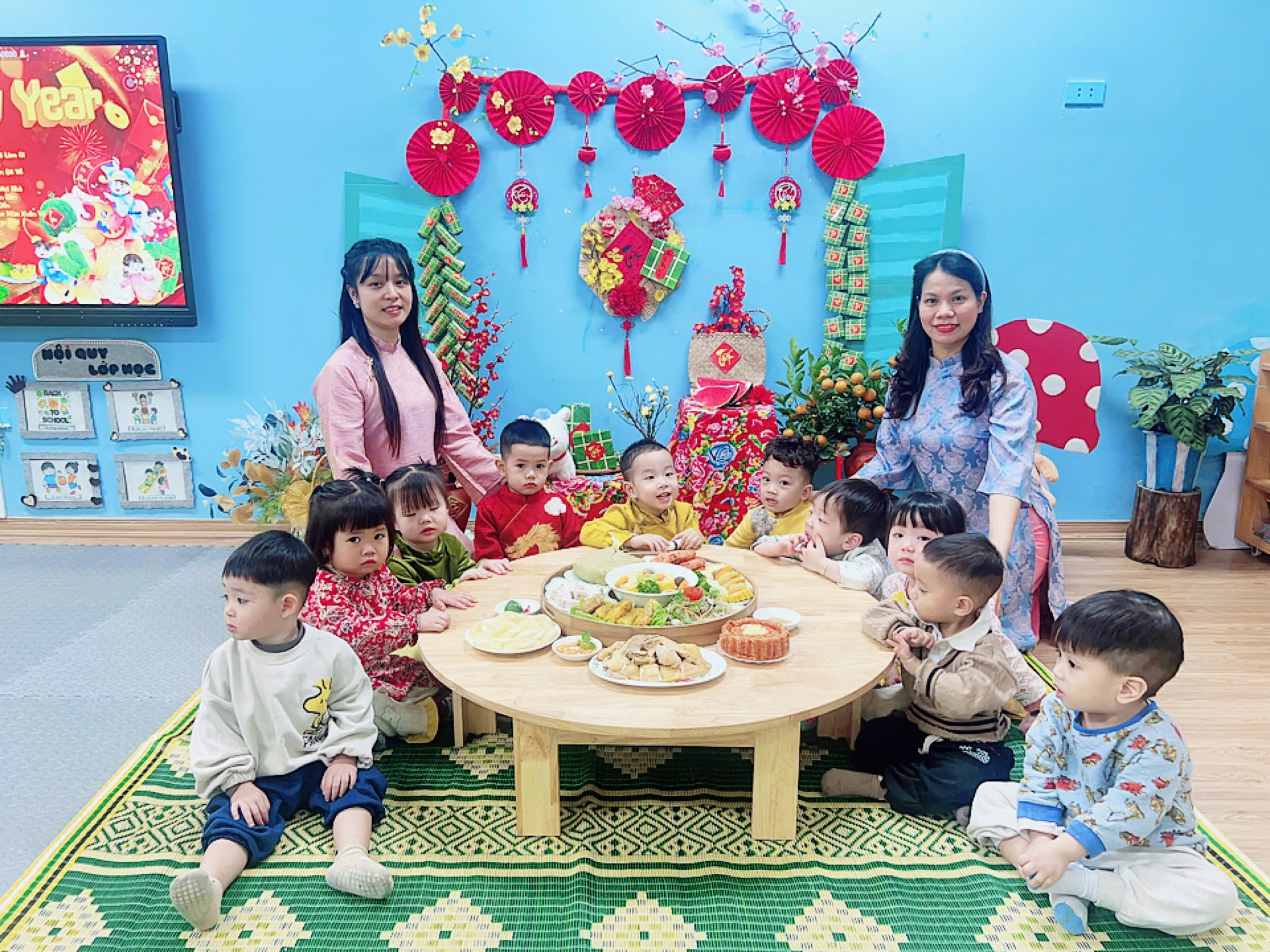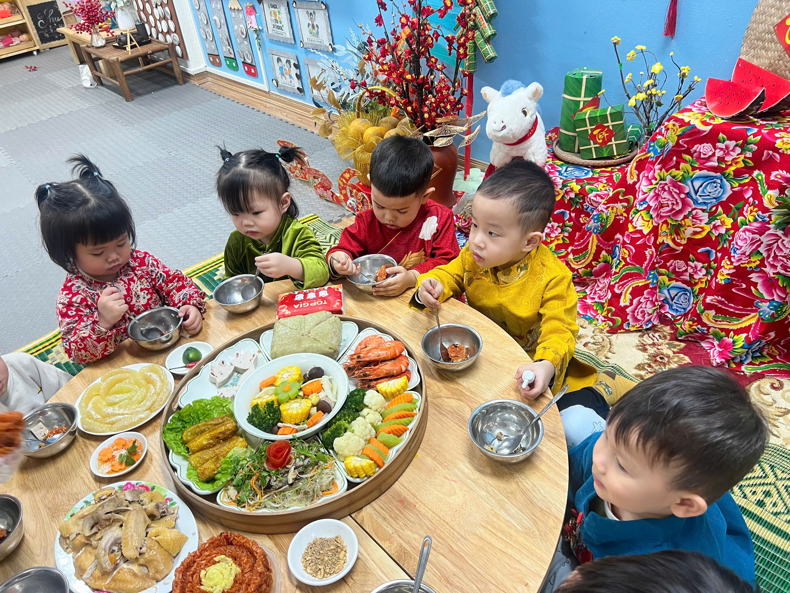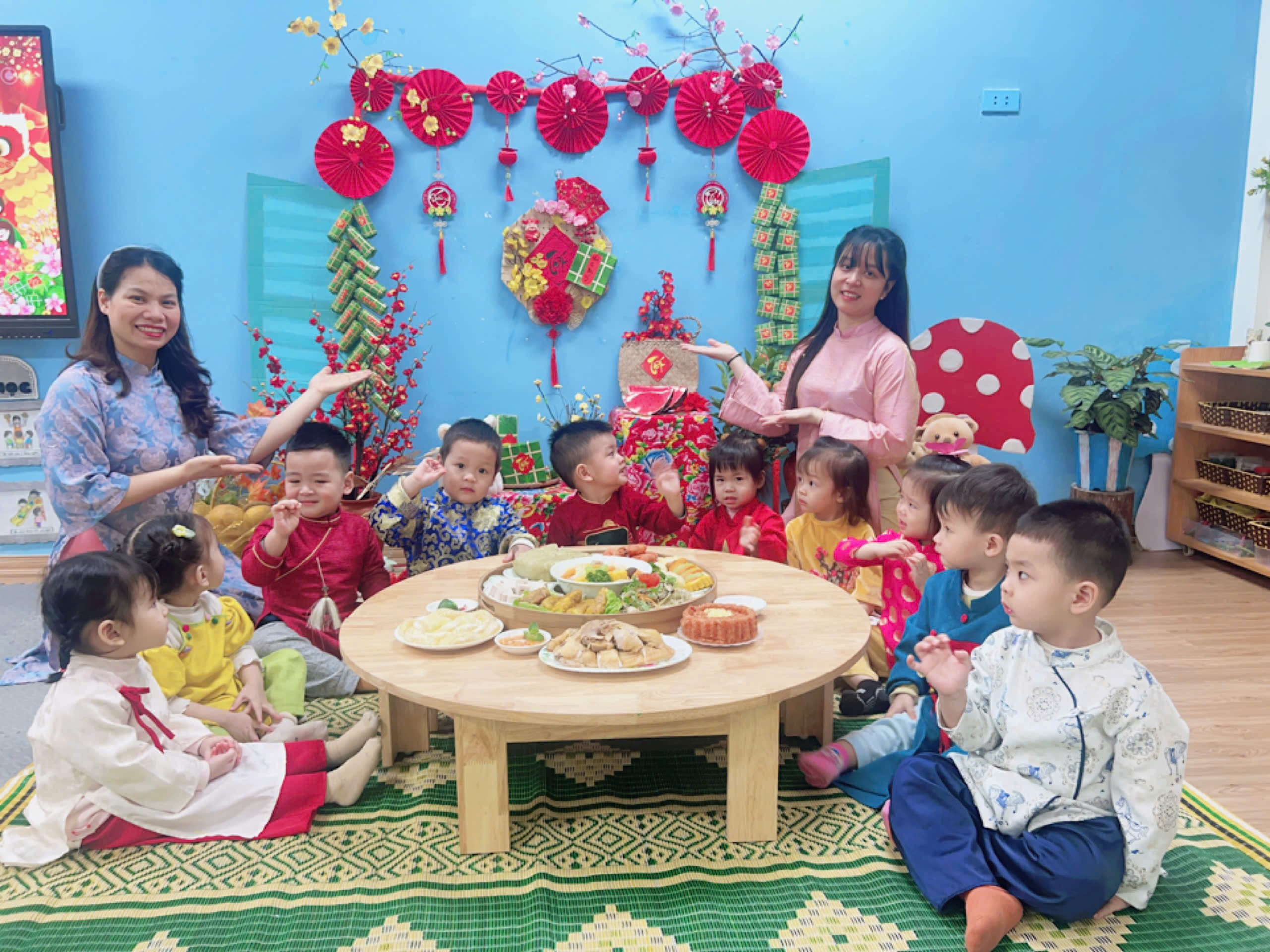 Những chiếc bàn được chuẩn bị gọn gàng, các món ăn quen thuộc hằng ngày bỗng trở nên đặc biệt hơn khi có thêm không khí Tết. Các con ngồi ngay ngắn bên cô và các bạn, ánh mắt háo hức, gương mặt rạng rỡ, bé nào cũng ngoan ngoãn và đáng yêu vô cùng.
