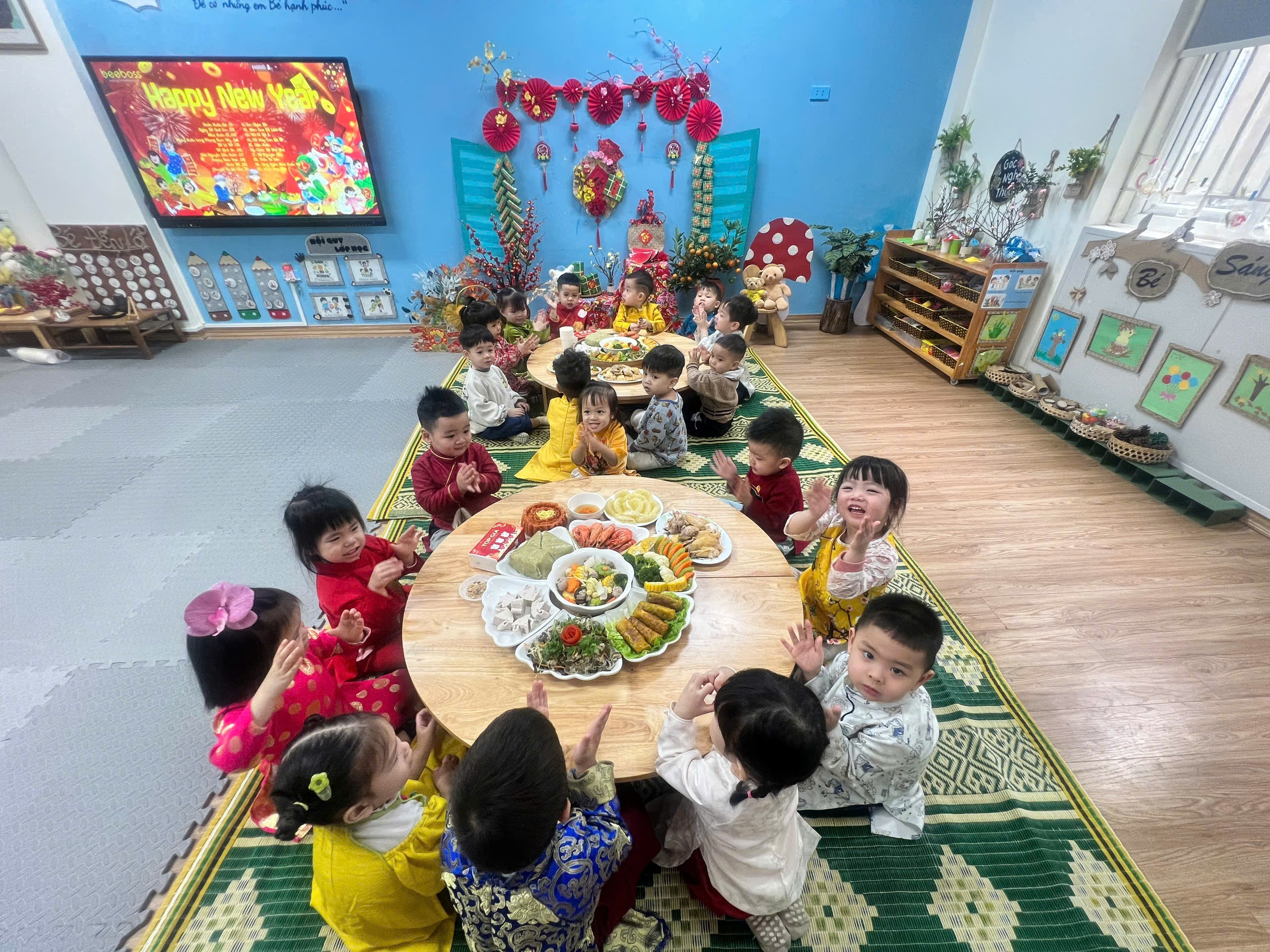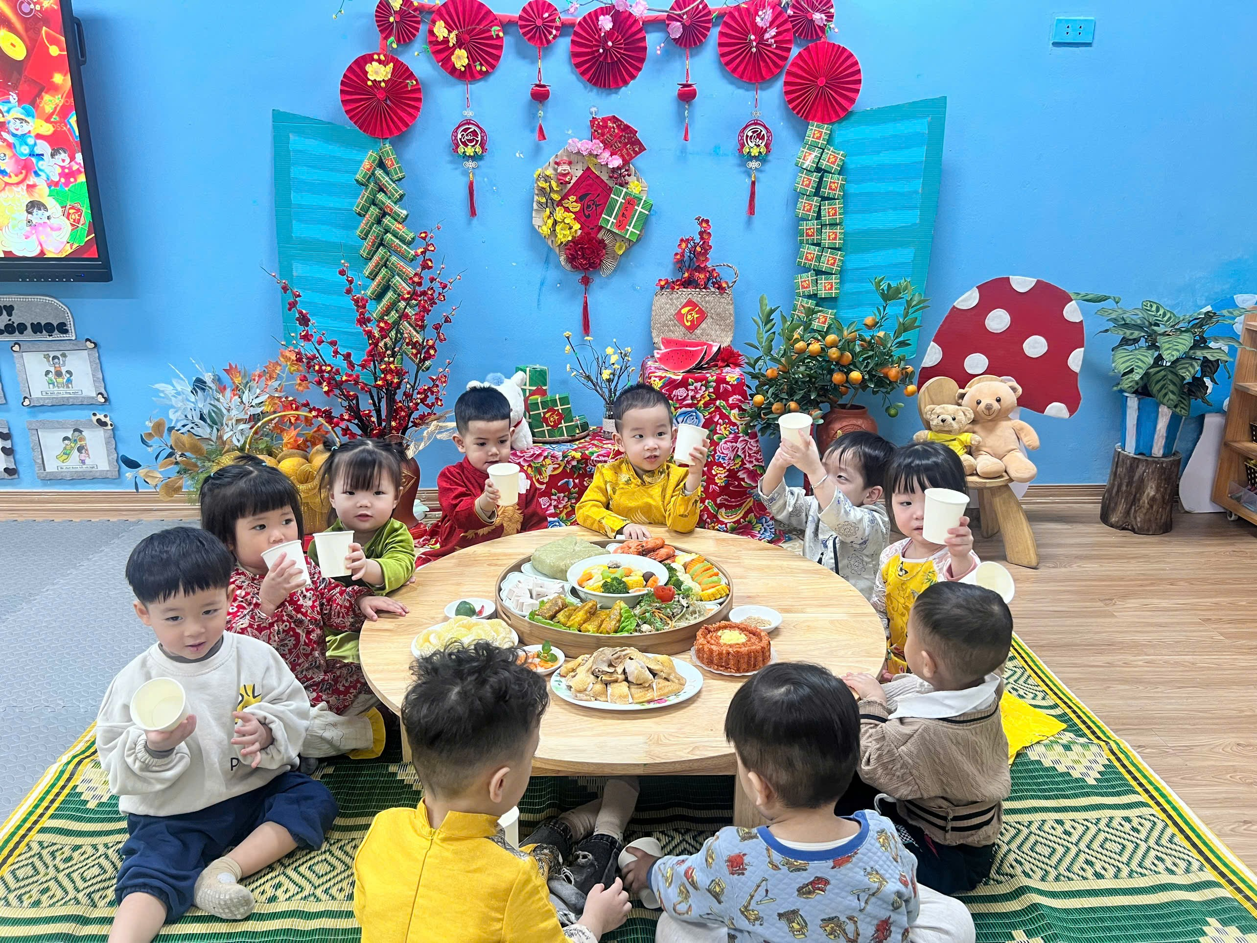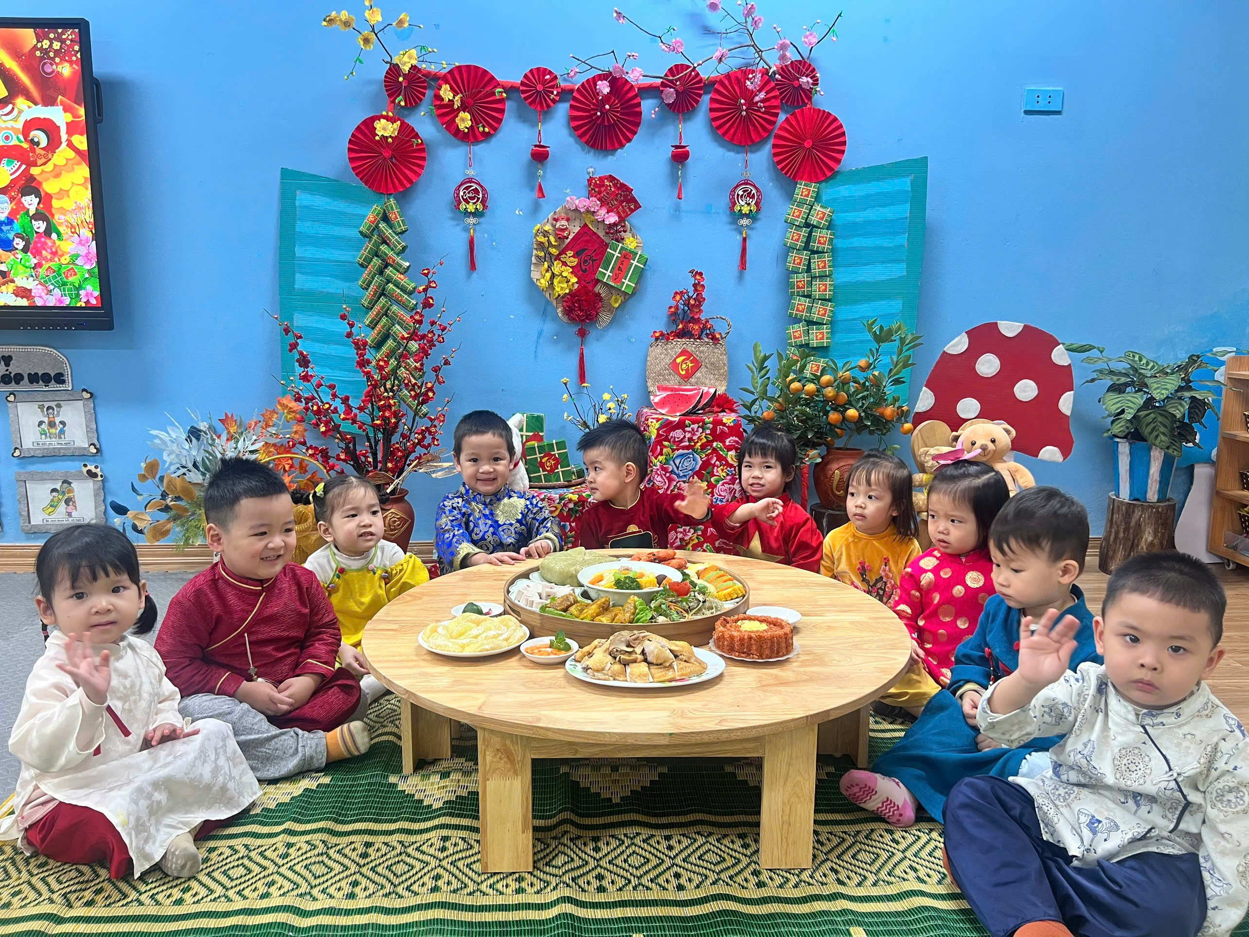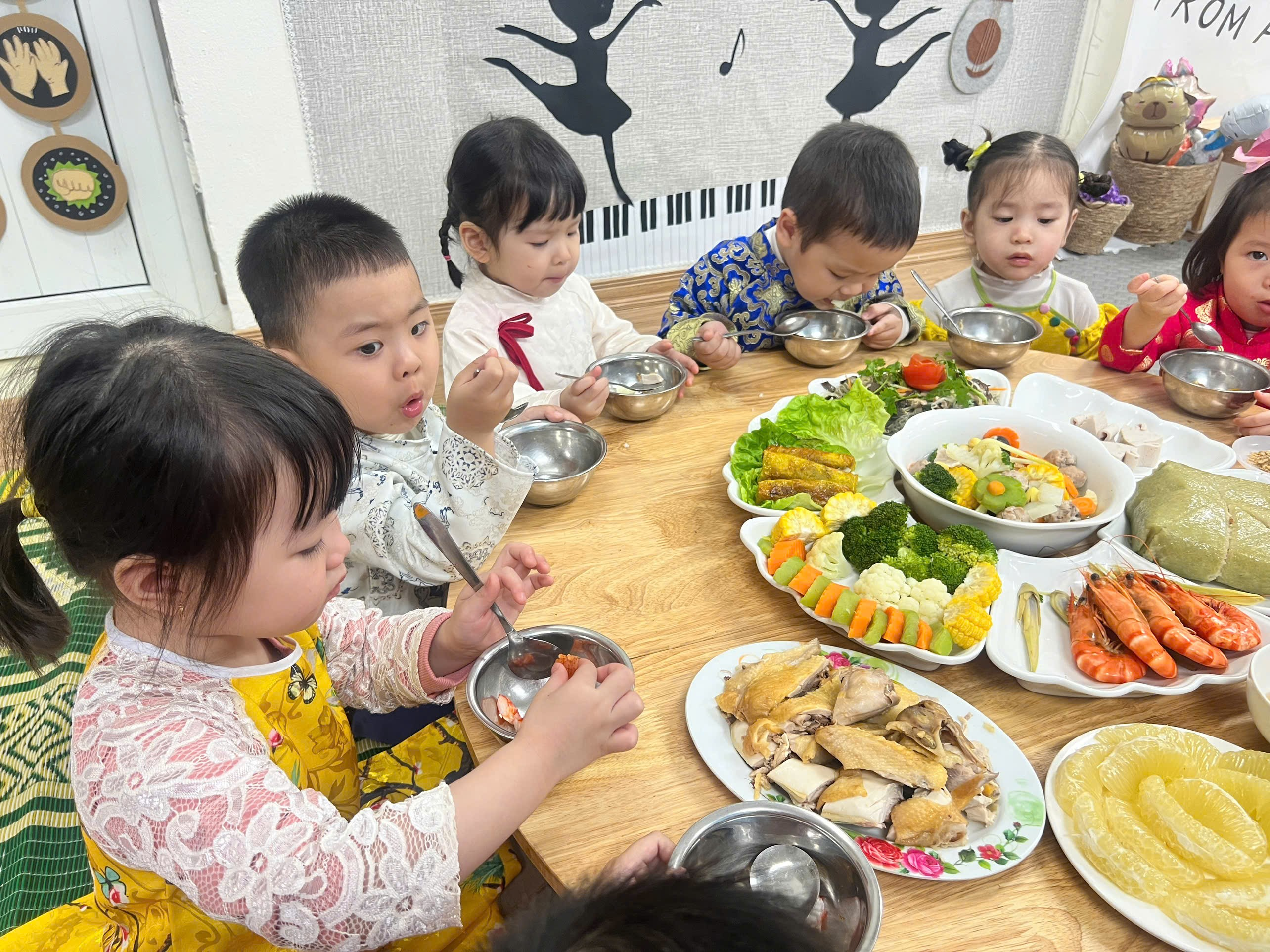 Những chiếc bàn được chuẩn bị gọn gàng, các món ăn quen thuộc hằng ngày bỗng trở nên đặc biệt hơn khi có thêm không khí Tết. Các con ngồi ngay ngắn bên cô và các bạn, ánh mắt háo hức, gương mặt rạng rỡ, bé nào cũng ngoan ngoãn và đáng yêu vô cùng.