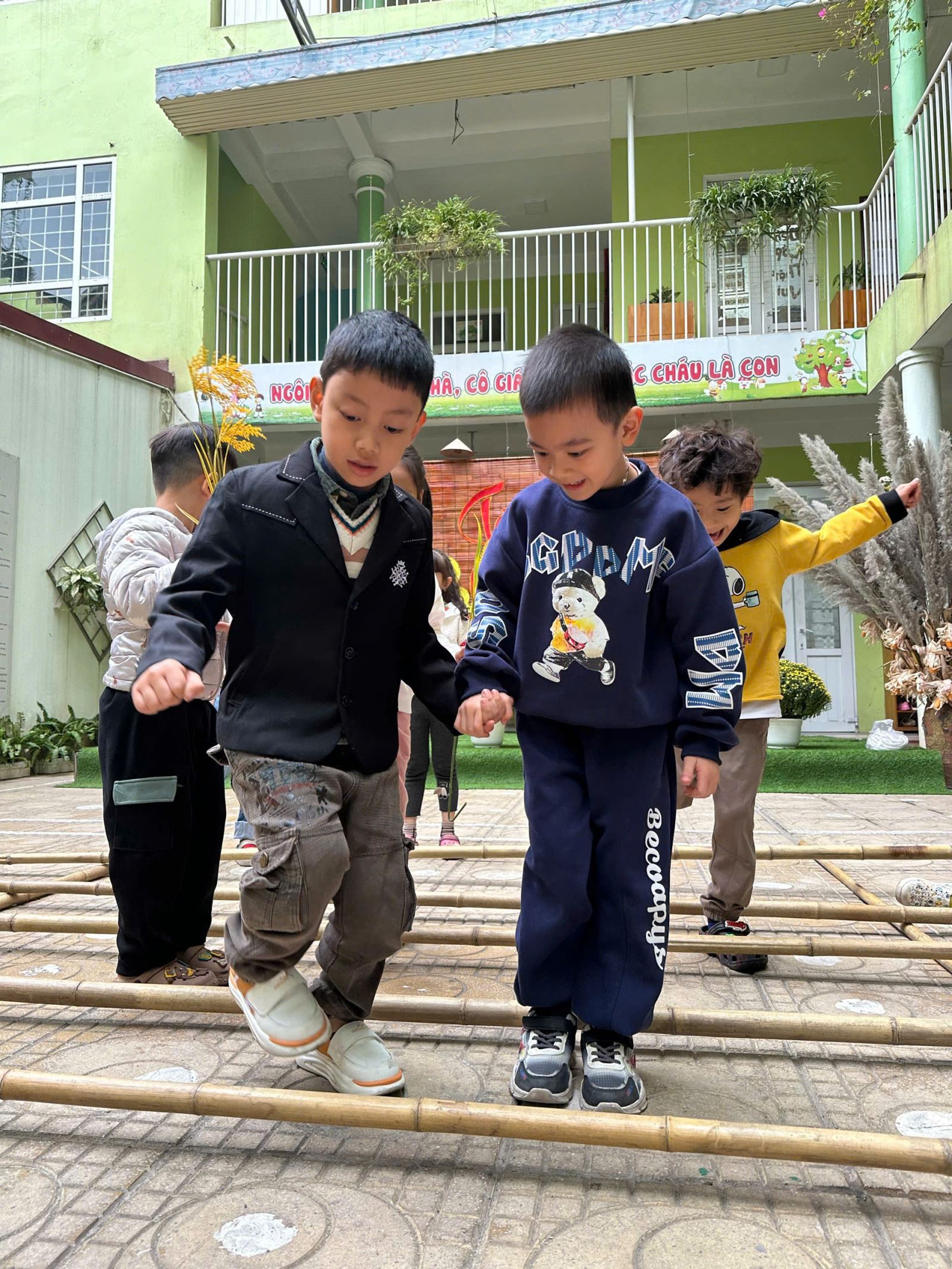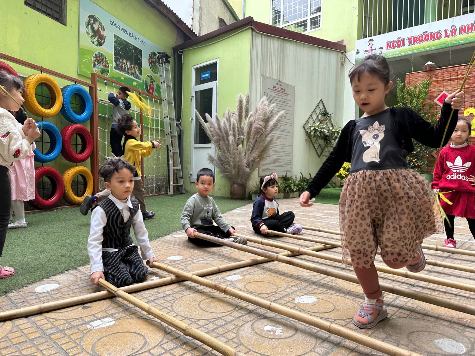 Các bé đã được tham gia vào các trò chơi dân gian vui nhộn, giúp các em hiểu thêm về văn hóa truyền thống và phát triển các kỹ năng vận động. Những trò chơi như kéo co, nhảy bao bố hay làm quen với bộ môn nhảy sạp đã mang lại những tiếng cười giòn giã và những giây phút giải trí vui vẻ.