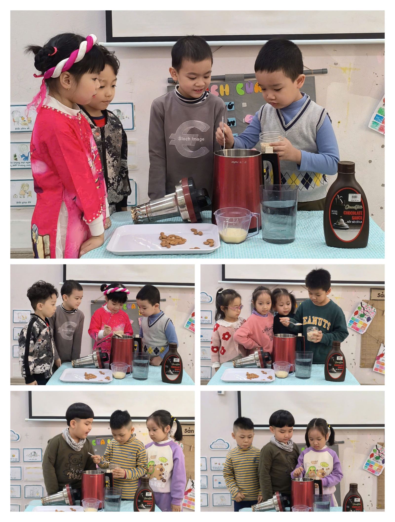 Bên cạnh đó, các bé và cô giáo còn cùng nhau làm sữa hạt cho buổi liên hoan. Quá trình làm sữa hạt không chỉ giúp các bé hiểu thêm về cách chế biến đồ uống lành mạnh, mà còn tăng cường sự khéo léo và tinh thần hợp tác. Những ly sữa hạt thơm ngon, bổ dưỡng đã được các bé tự tay pha chế và thưởng thức.