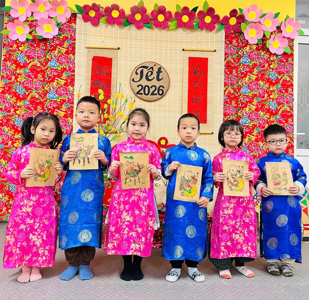 Áo dài khoe sắc thắm, bé đón tết xum vầy của Các bé lớp Nhà trẻ D1.