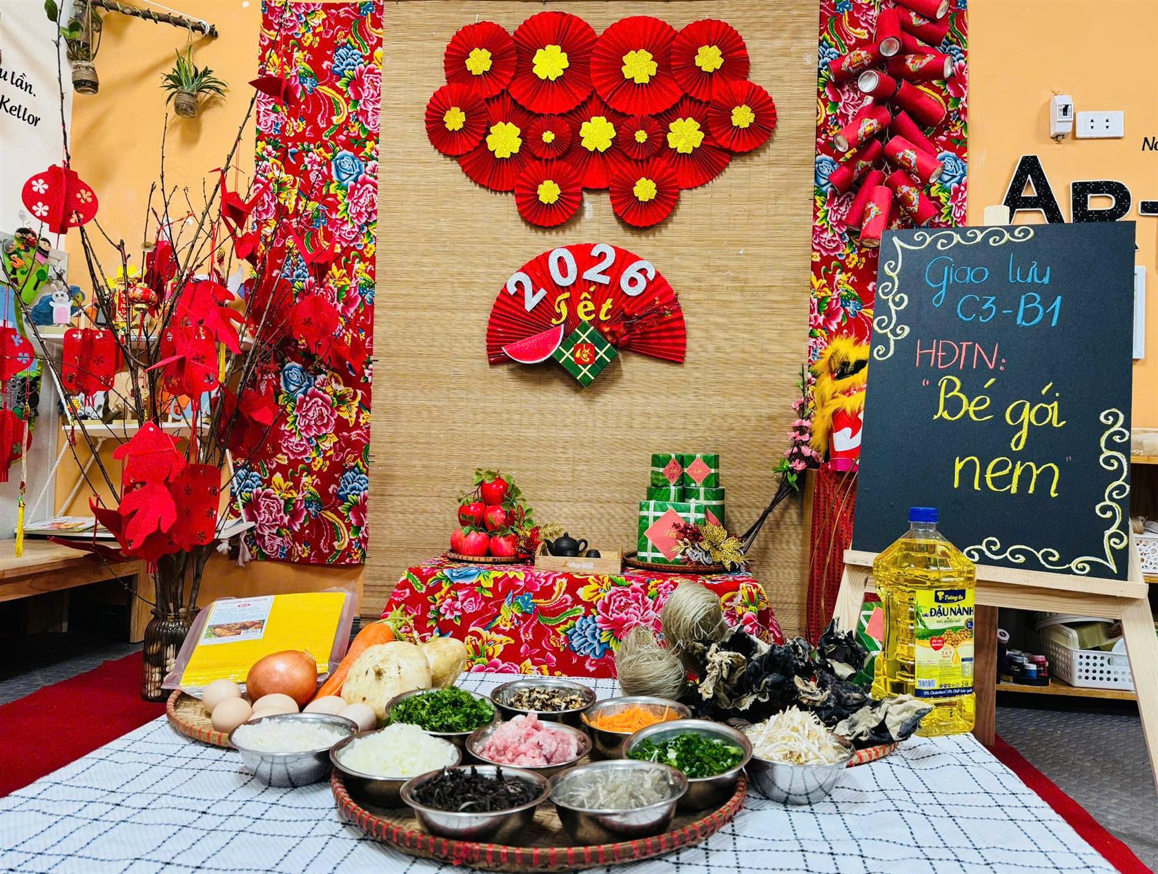 - Nhằm tạo cơ hội cho các bé được trải nghiệm và tìm hiểu thêm về nét đẹp văn hóa truyền thống của dân tộc, lớp B1 và C3 đã tổ chức hoạt động giao lưu ý nghĩa với nội dung “Bé gói nem Tết”.