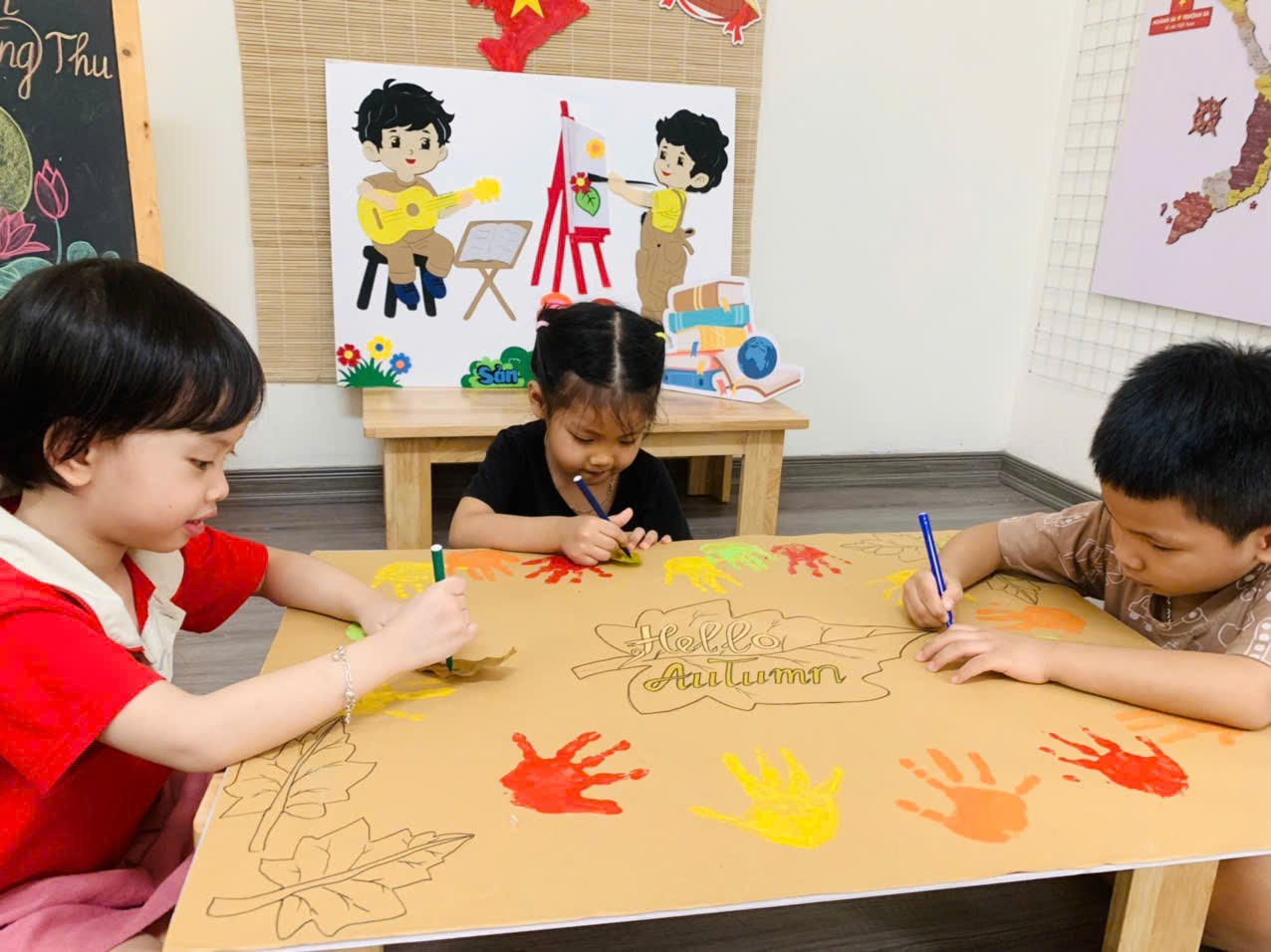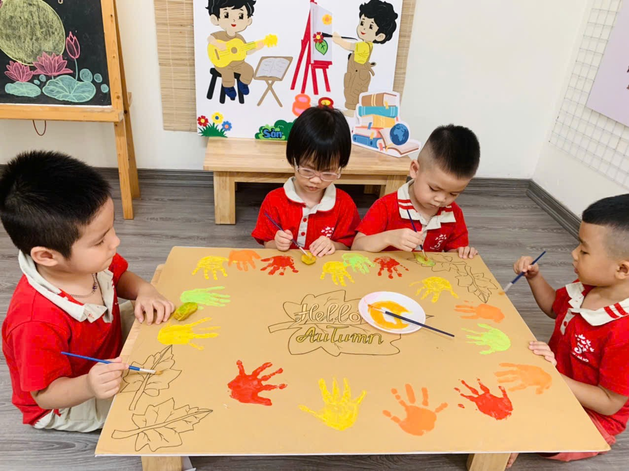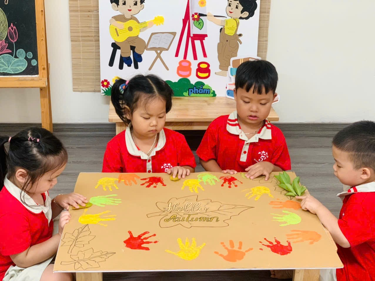 Mời bố mẹ cùng ngắm nhìn những khoảnh khắc đáng yêu của các con khi thực hiện tạo bức tranh mùa thu tuyệt vời nhé!