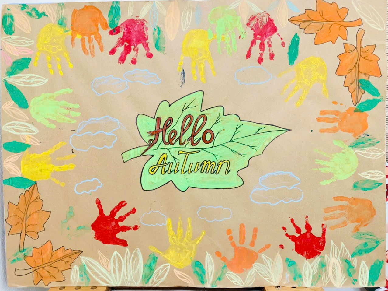 Để giữ lại hình ảnh đẹp về mùa thu trong mắt bé. Cô trò lớp mẫu nhỡ B2 đã sử dụng những nguyên vật liệu dễ tìm, gần gũi như phấn, giấy bìa, lá khô, chấm màu nước, in bàn tay... Bạn thì in lá cây, bạn thì tô màu dạ, bạn vẽ phấn, một số bạn thì in màu hình bàn tay xinh xắn, cùng với sự gợi ý của cô giáo, cô và các bé đã hoàn thành bức tranh thật đẹp và sáng tạo với nhiều màu sắc của mùa thu. Bạn nào cũng rất vui và đoàn kết, cùng nhau tạo nên một bức tranh mùa thu.