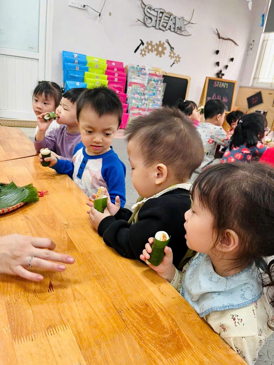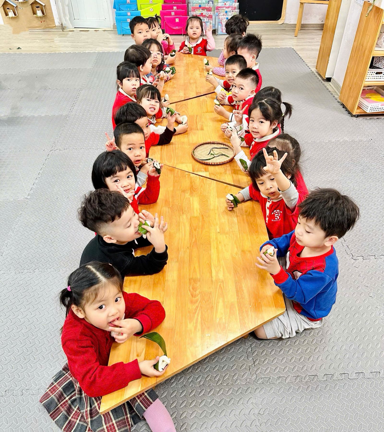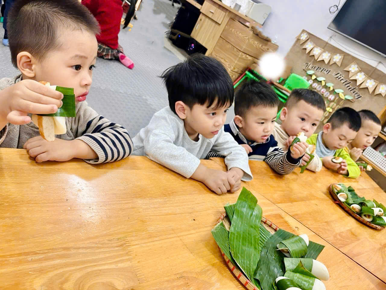 Sau khi được cô giáo kể chuyện và khám phá sự đặc biệt của món ăn này trong văn hóa Việt Nam, các bé rất thích thú và háo hức. Đặc biệt, hoạt động được mong chờ nhất chính là giờ thưởng thức bánh giầy, khi các bé được tận tay cầm, ngắm và nếm thử vị dẻo thơm của món ăn truyền thống này. Nhiều bạn nhỏ còn hào hứng thưởng thức hết phần bánh của mình với gương mặt đầy vui thích.