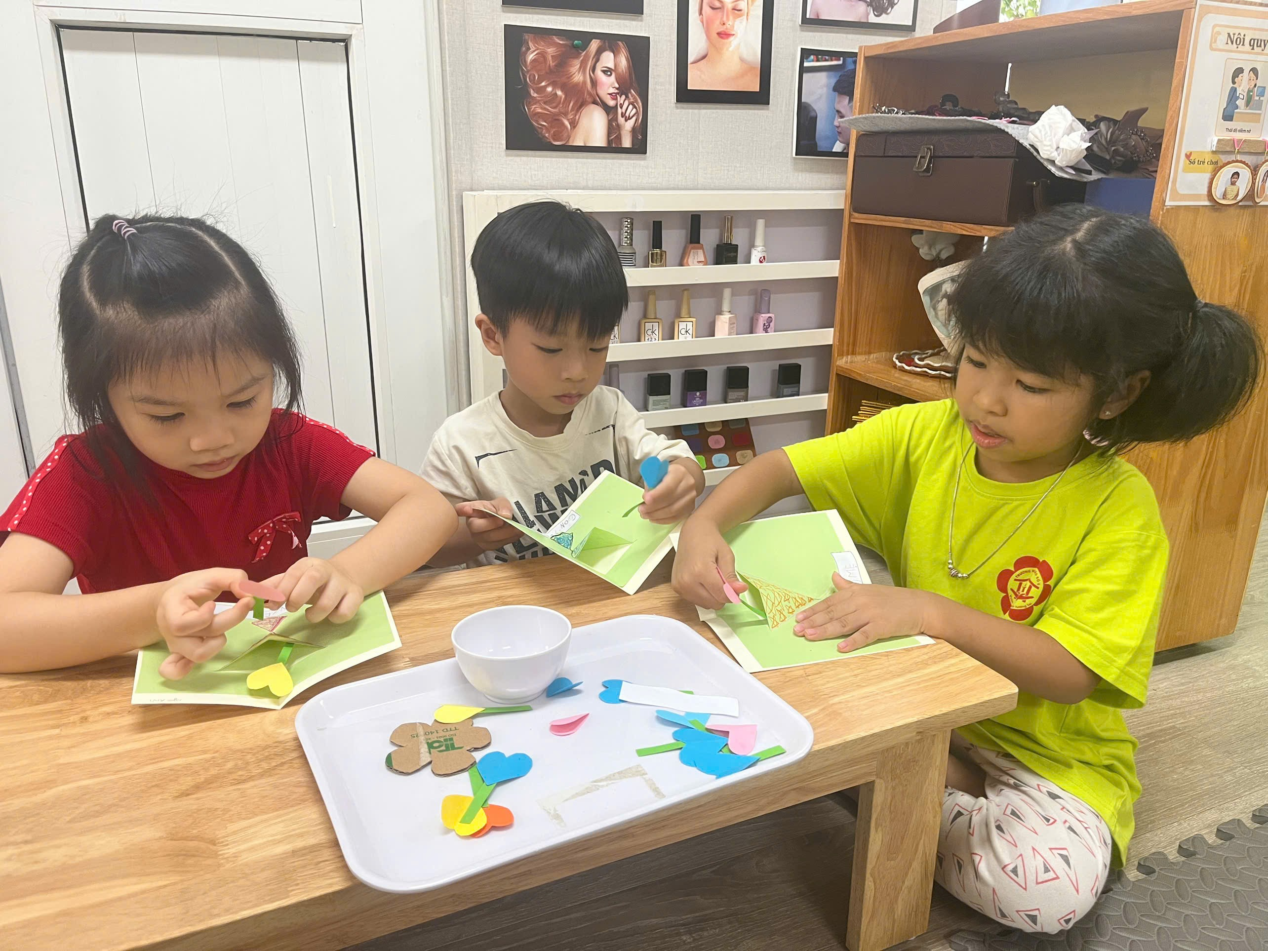 Trước tiên, các con cùng nhau làm bưu thiếp bằng bìa màu tặng mẹ. Từng tấm thiệp nhỏ xinh được trang trí bằng đôi bàn tay khéo léo và chứa đựng biết bao tình yêu thương dành cho mẹ.