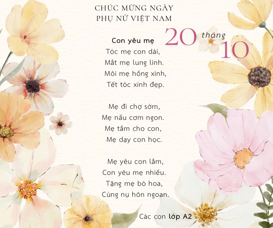 Nhân dịp kỷ niệm Ngày Phụ nữ Việt Nam 20/10, các bé lớp mẫu giáo lớn A2 đã tham gia một chuỗi hoạt động thật ý nghĩa và vui tươi.
