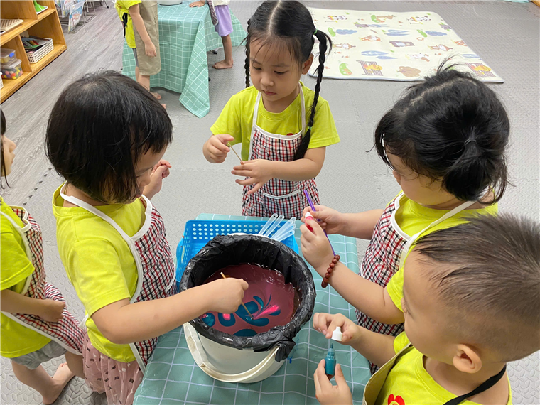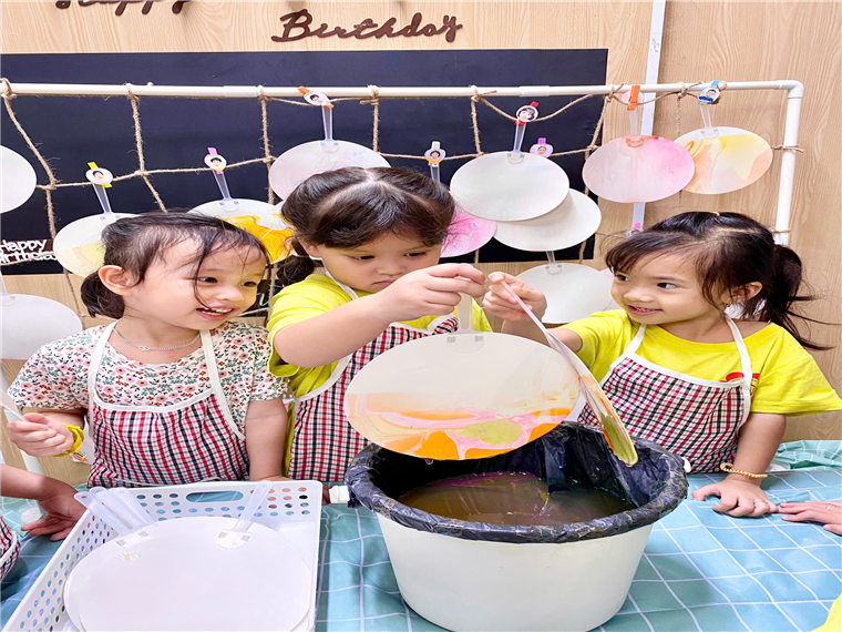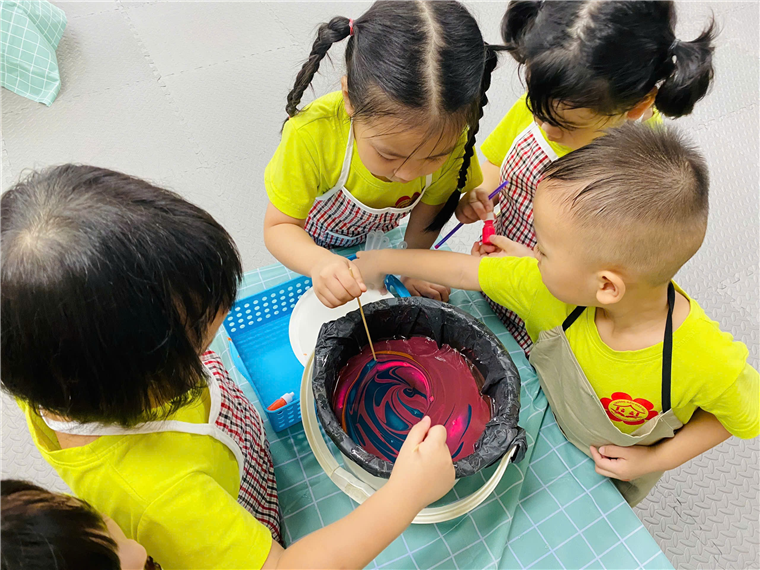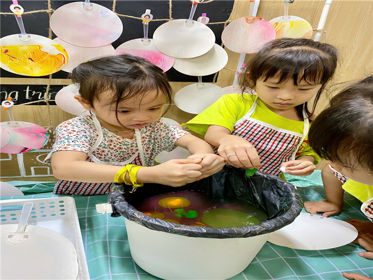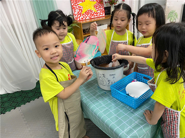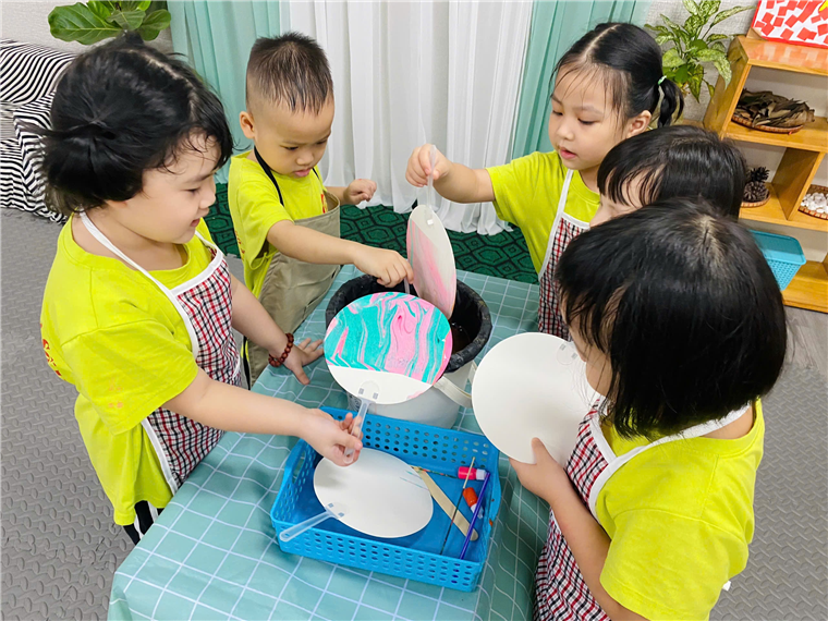 Một hoạt động thủ công độc đáo khác trong dự án là làm quạt thủy ấn. Các bé đã học cách pha màu, tạo hình nghệ thuật trên mặt nước và nhúng giấy để tạo nên những chiếc quạt với hoa văn vô cùng độc đáo. Mỗi chiếc quạt đều mang dấu ấn cá nhân của bé, là món quà tinh thần đầy ý nghĩa gửi tới mẹ nhân ngày 20/10. Các bé đã tỉ mỉ từng bước, từ gấp giấy đến trang trí quạt, và không quên gửi gắm những lời yêu thương tới mẹ khi tặng quạt.