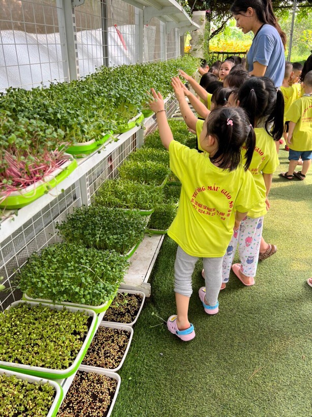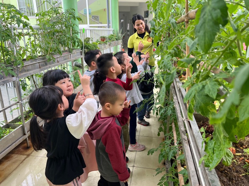 Sau khi trẻ có những kiến thức cơ bản, cô giáo đã đưa trẻ đi thăm quan các vườn cây của trường, chỉ cho trẻ sự phát triển của cây qua các thời kì, giúp trẻ có được sự trải nghiệm thực tế. Các con rất hào hứng khi nhìn thấy cây cà chua, cây ray cải lớn... lên từng ngày. Từ những mầm cây nhỏ xíu, mọc ra những chiếc lá đầu tiên, rồi ra hoa và ra quả.