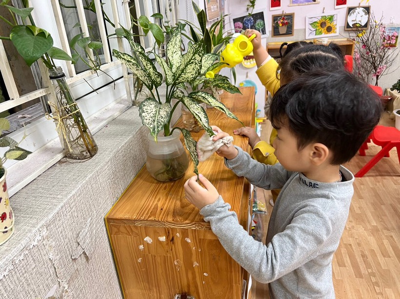 Những công việc hàng ngày như chăm sóc cây xanh, lau lá, tưới cây tại lớp cũng được các cô phân công cho các bạn trực nhật để từ đó hình thành nên những thói quen đáng quý.