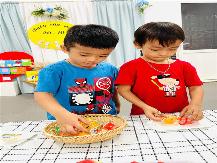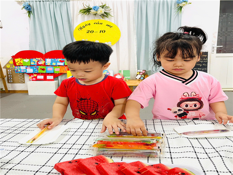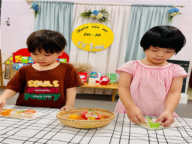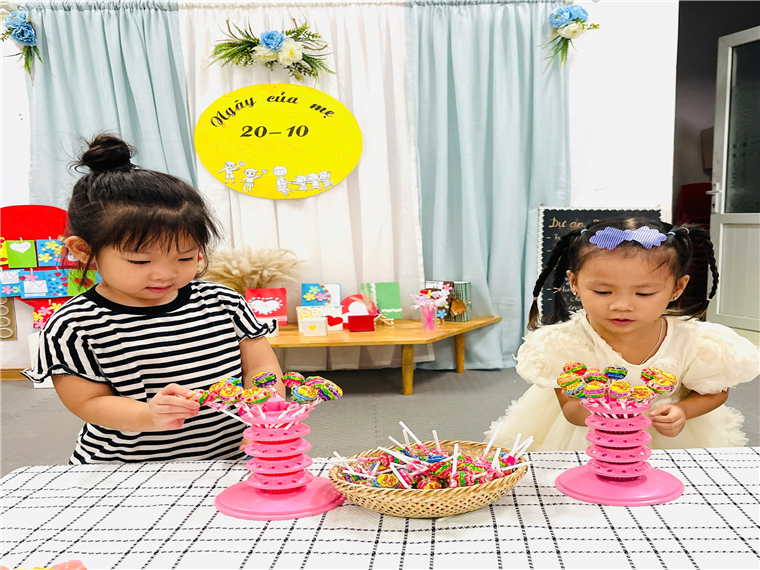 Nói tiếp hoạt động làm quà tặng mẹ, các cô đã tổ chức cho các con buổi liên hoan vui vẻ và ý nghĩa. Từ những kinh nghiệm trong hoạt động vui chơi hàng ngày, các con cùng nhau sắp xếp, cùng nhau trưng bày, trang trí bàn tiệc, múa hát, và cùng nhau vui liên hoan…