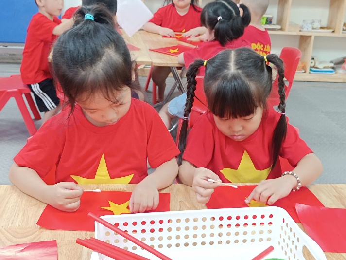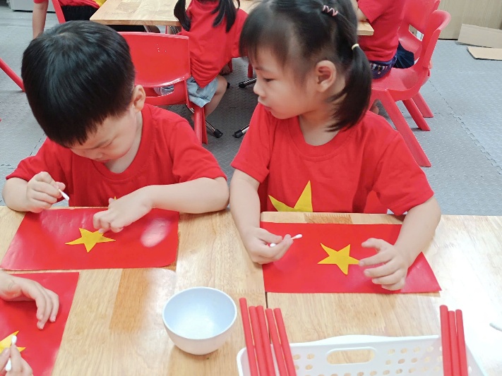 Dưới sự hướng dẫn của các cô giáo, mỗi bé đã tự tay thực hiện sản phẩm của mình bằng cách dán ngôi sao vàng năm cánh lên nền giấy đỏ – biểu tượng thiêng liêng của quốc gia. Các bé còn khéo léo dán thêm cán cờ để hoàn thiện sản phẩm. Qua hoạt động này, các con không chỉ được rèn luyện kỹ năng khéo léo, tính kiên trì mà còn được giáo dục lòng yêu nước, niềm tự hào dân tộc ngay từ khi còn nhỏ.