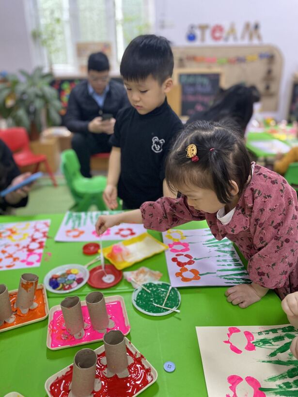 Các con tạo hình bông hoa từ lõi giấy vệ sinh và tăm bông