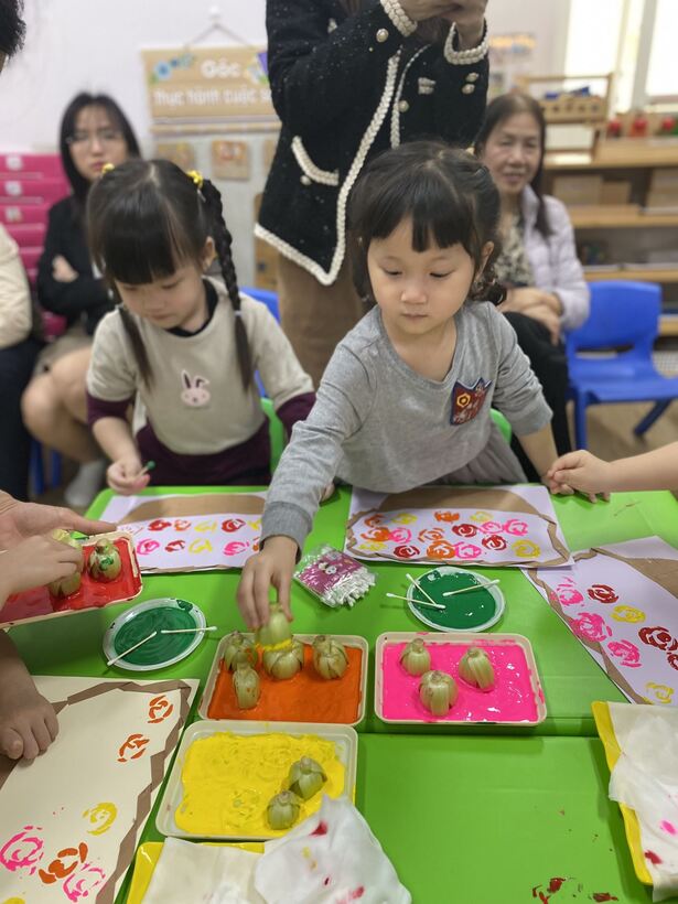 Ngày hôm nay, lớp C2 đã tổ chức hoạt động tạo hình "Món quà con tặng mẹ". Với hoạt động này, các con đã sử dụng nhiều nguyên liệu khác nhau như lõi giấy vệ sinh, gốc cây cải, bông tăm, màu nước... để tạo nên những bông hoa xinh xắn dành tặng mẹ mình.