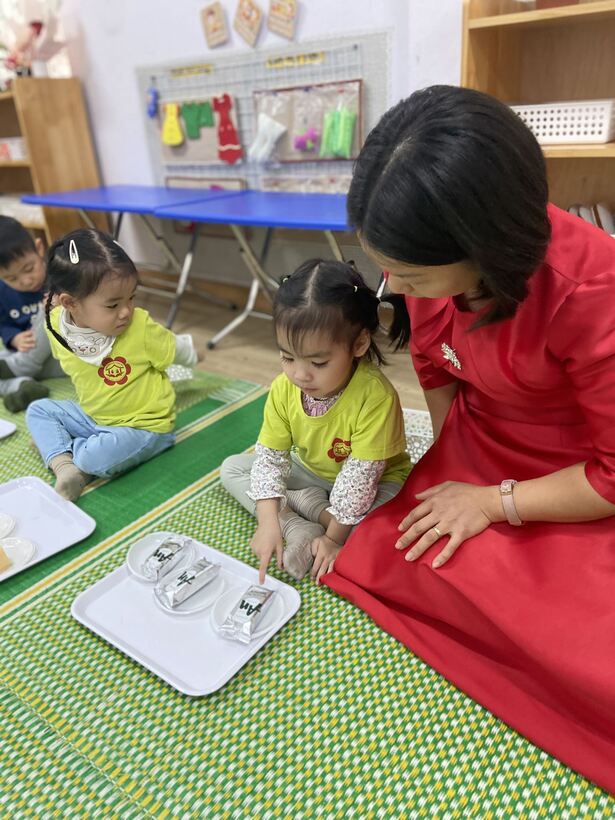 Các con được các cô giáo hướng dẫn cách xếp tương ứng 1:1 với các món đồ bánh kẹo, đĩa nhựa…