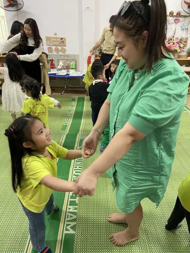 Các phụ huynh tham gia vận động theo nhạc cùng các con.