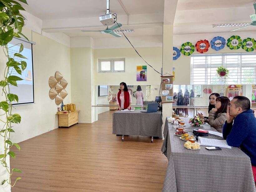 Phần thi thuyết trình của cô giáo Trương Thị Mơ với đề tài “Một số giải pháp tiếp cận ứng dụng phương pháp Reggio Emilia vào thiết kế môi trường từ những nguyên vật liệu thiên nhiên cho lứa tuổi mẫu giáo nhỡ”.