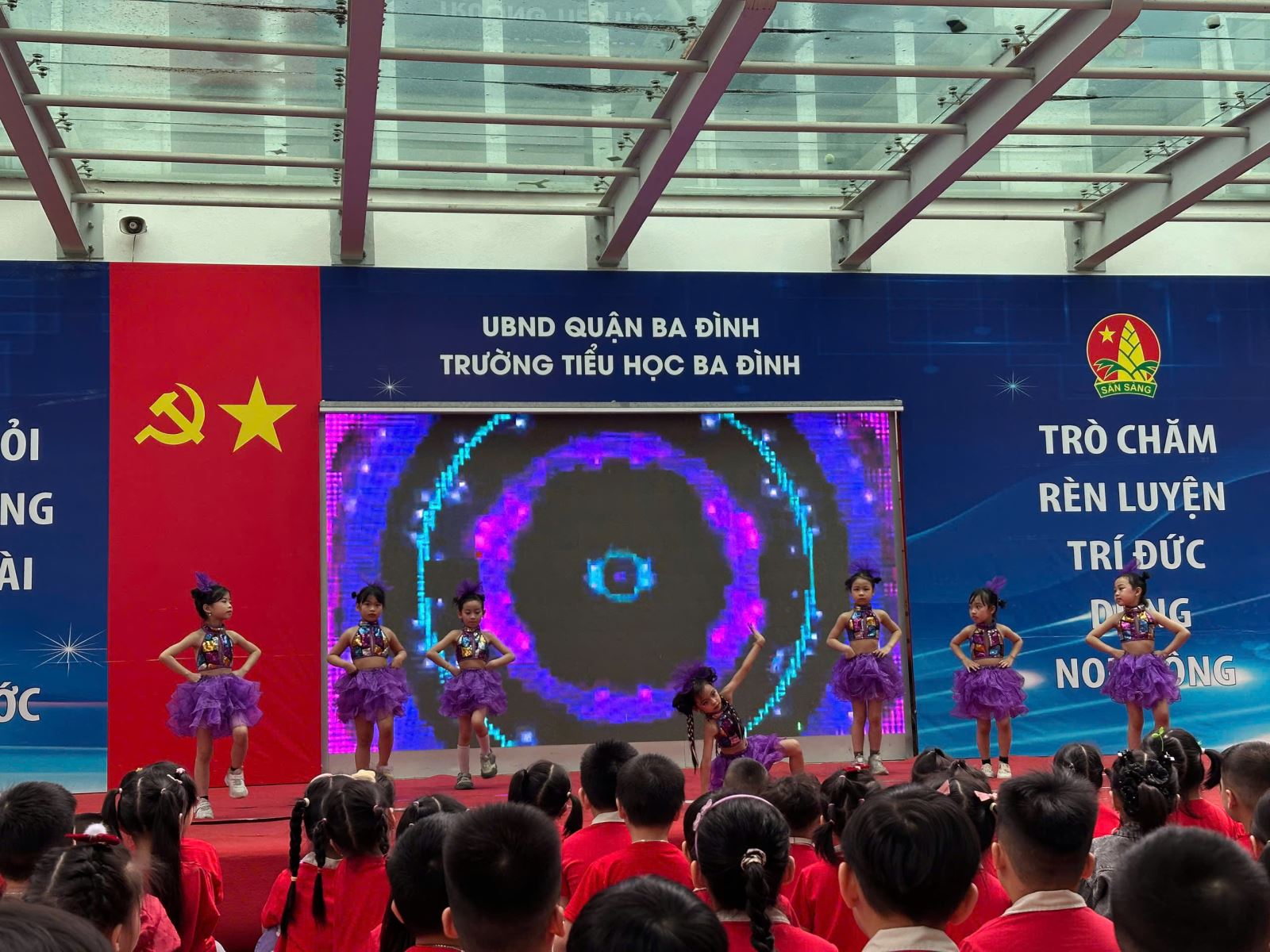 Sau màn tặng hoa và quà, không khí càng thêm gắn kết với tiết mục giao lưu "Liên khúc 1 vòng Việt Nam- Khát vọng tuổi trẻ" và video giới thiệu về Trường Tiểu học Ba Đình, giúp các con có cái nhìn tổng quan về ngôi trường mình sắp theo học.