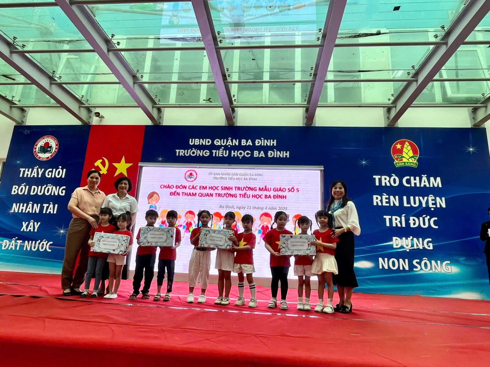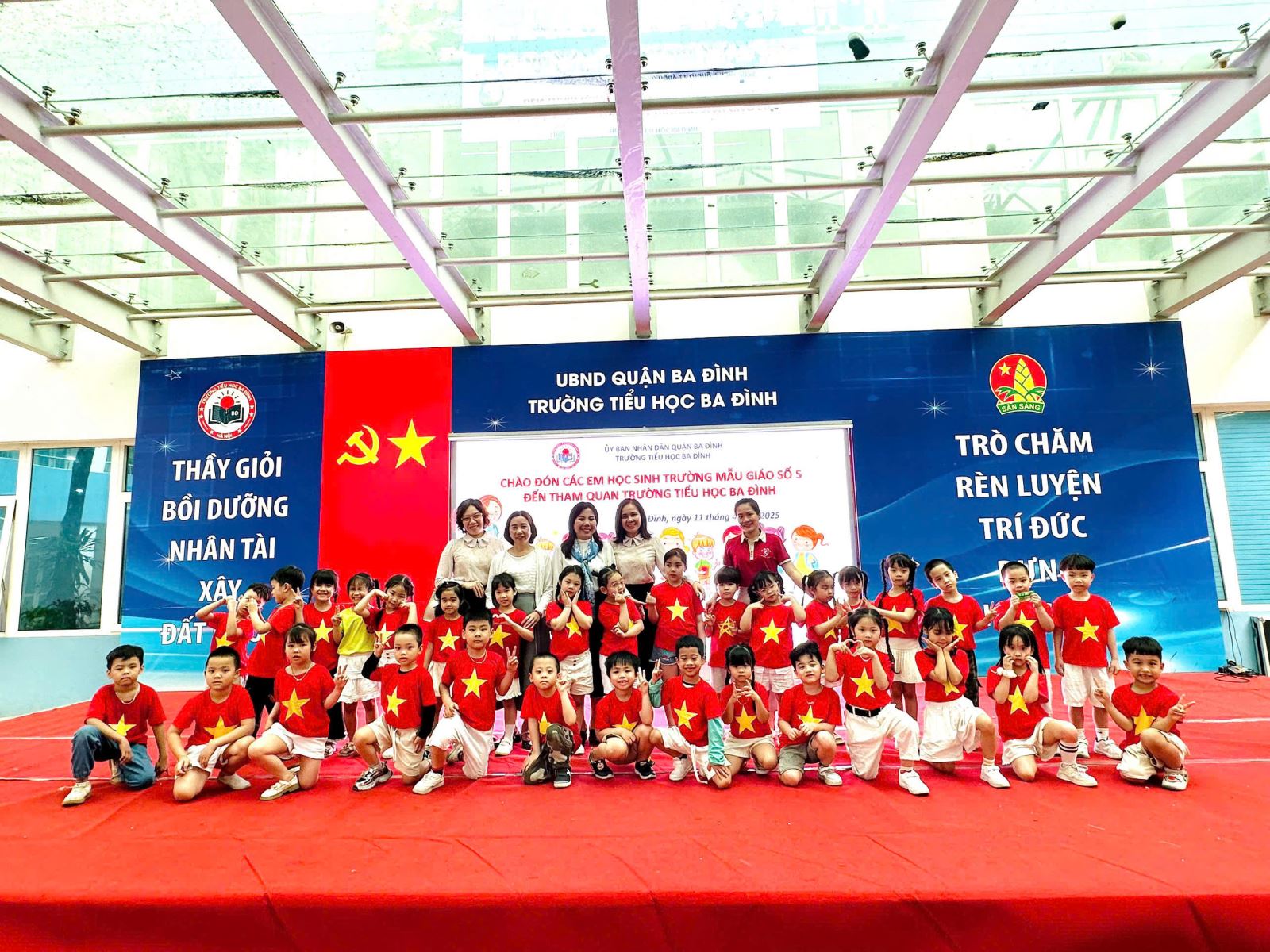 Đón tiếp đoàn tại cổng trường là sự chào đón nồng nhiệt của Ban Giám hiệu Trường Tiểu học Ba Đình, gồm cô Nguyễn Thị Thu Hà – Hiệu trưởng, cô Phạm Minh Thúy và cô Bùi Thị Lan Hương – Phó Hiệu trưởng. Về phía Trường Mẫu giáo Số 5, có sự hiện diện của cô Nguyễn Thanh Hằng – Hiệu trưởng, cô Nguyễn Thị Thu Trang và cô Hoàng Thị Tuyết – Phó Hiệu trưởng, cùng các cô giáo 4 lớp Mẫu giáo lớn.