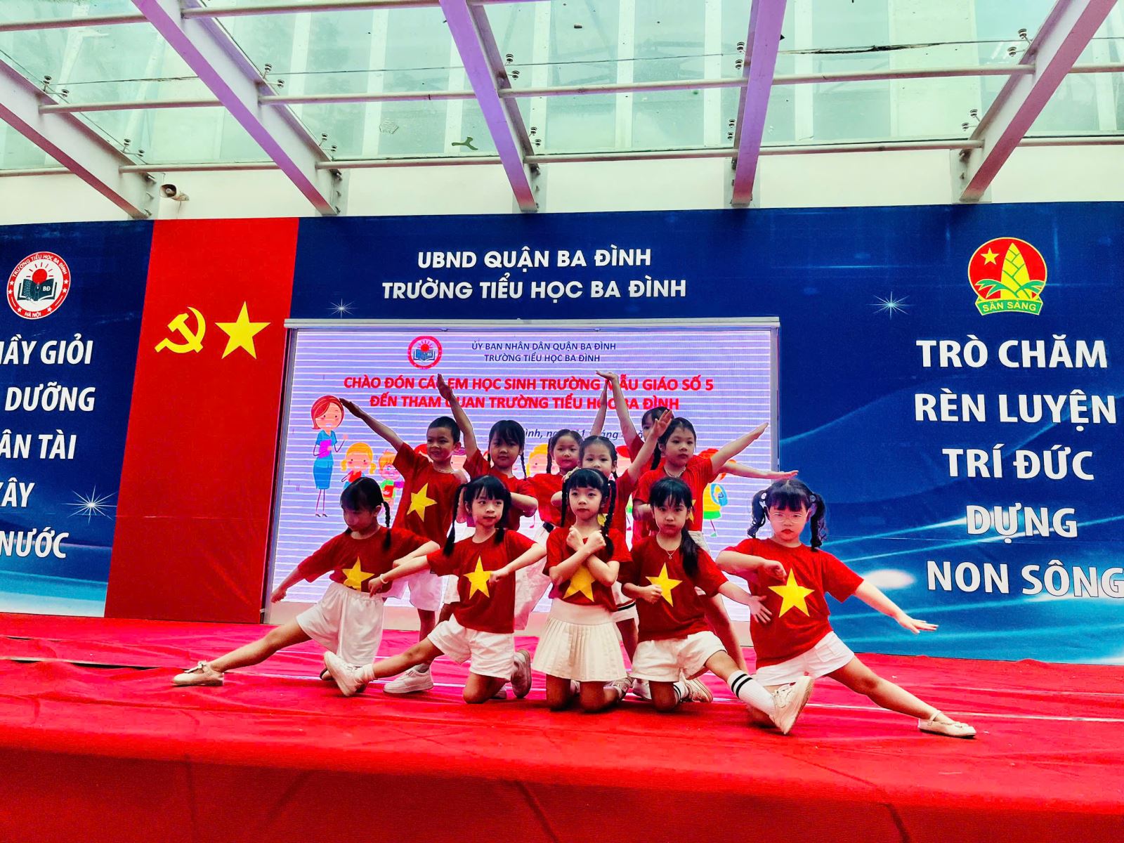 Buổi giao lưu bắt đầu thật sôi động với các tiết mục văn nghệ đặc sắc do các anh chị học sinh Trường Tiểu học Ba Đình biểu diễn chào mừng. Cô Nguyễn Thị Thu Hà – Hiệu trưởng Trường Tiểu học Ba Đình đã có bài phát biểu ấm áp, chào mừng các bạn nhỏ Trường Mẫu giáo Số 5 đến thăm trường. Đáp lại tình cảm đó, cô Nguyễn Thanh Hằng – Hiệu trưởng Trường Mầm non Số 5 đã thay mặt nhà trường tặng lẵng hoa tươi thắm, bày tỏ lời cảm ơn chân thành đến sự đón tiếp chu đáo của Trường Tiểu học Ba Đình. Các bạn nhỏ Mẫu giáo Số 5 cũng vô cùng vui mừng khi nhận được những món quà lưu niệm nhỏ xinh từ các thầy cô trường Tiểu học.