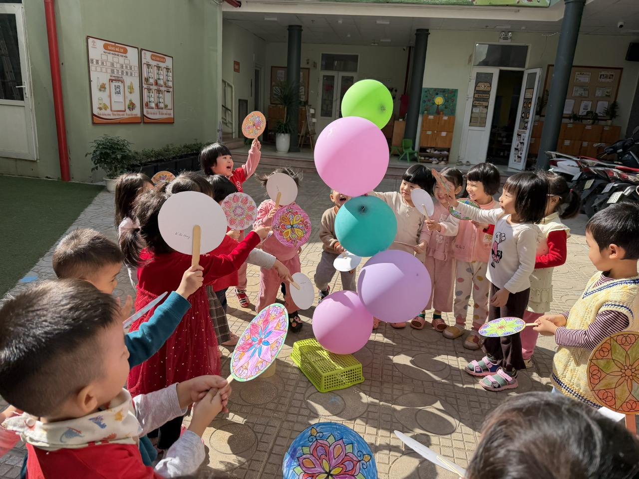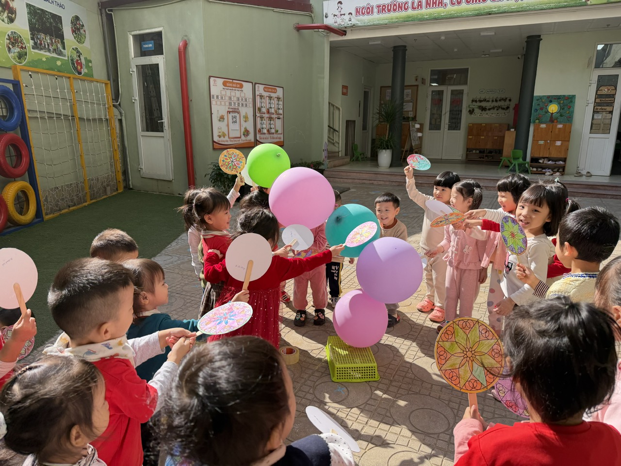 Phần hấp dẫn nhất chính là hoạt động khám phá khoa học về gió! Sau khi hoàn thành chiếc quạt của mình, các bé đã cùng nhau ra sân trường để trải nghiệm. Các cô giáo đã sử dụng những quả bóng bay nhiều màu sắc và những chiếc quạt xinh xắn do chính tay các con làm để thực hiện thử nghiệm.