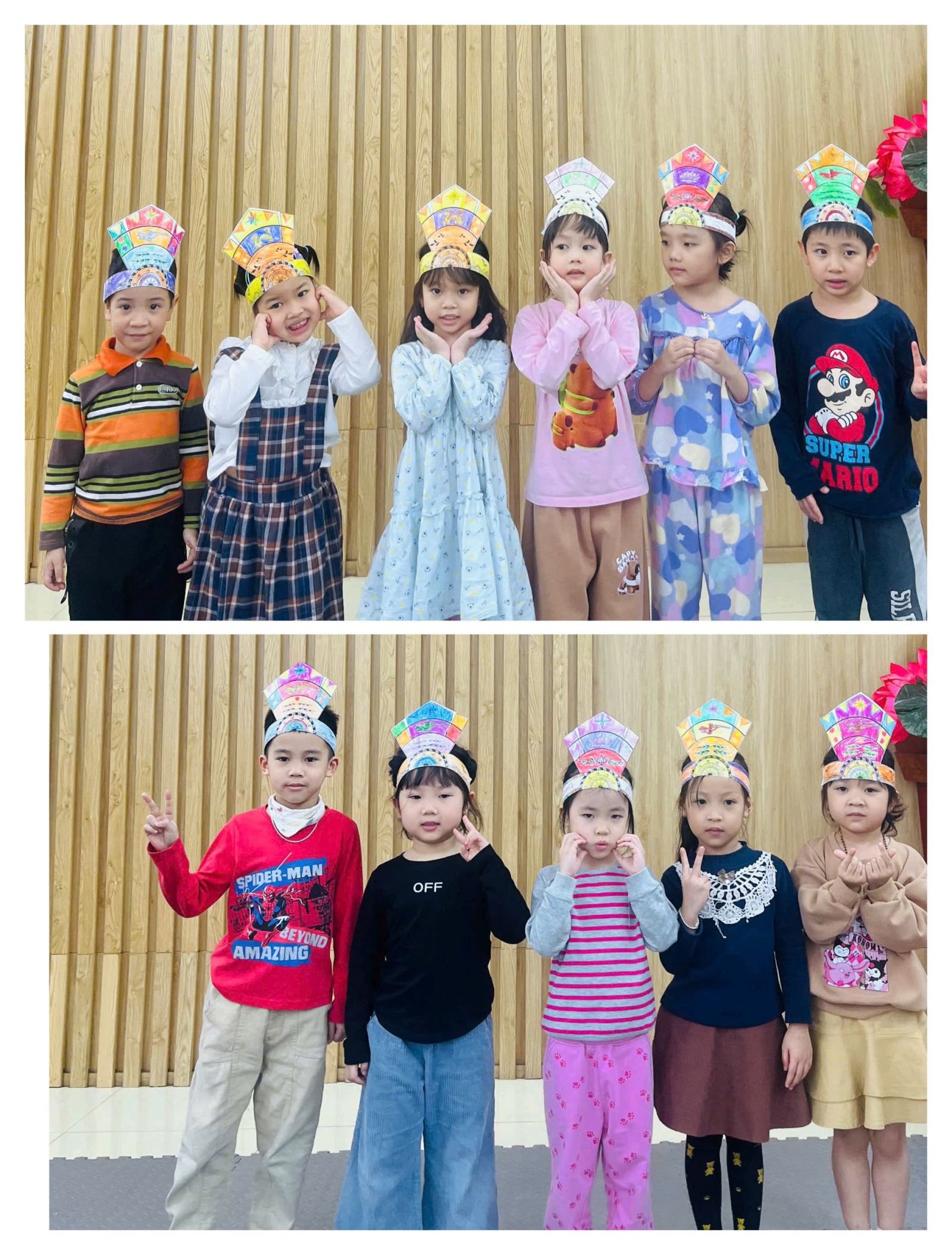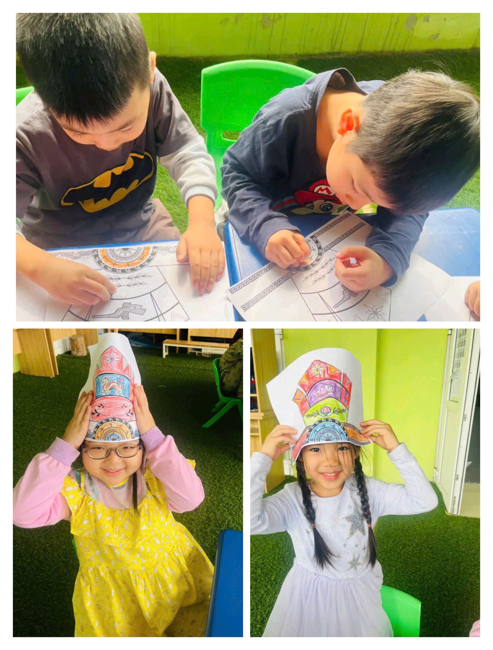 Với những nguyên vật liệu đơn giản như giấy, màu, bìa... cùng sự hướng dẫn tận tình của các cô giáo, các bé đã tự tay trang trí những chiếc mũ rực rỡ sắc màu, mô phỏng hình ảnh chiếc mũ của các vị Vua Hùng thời xưa.