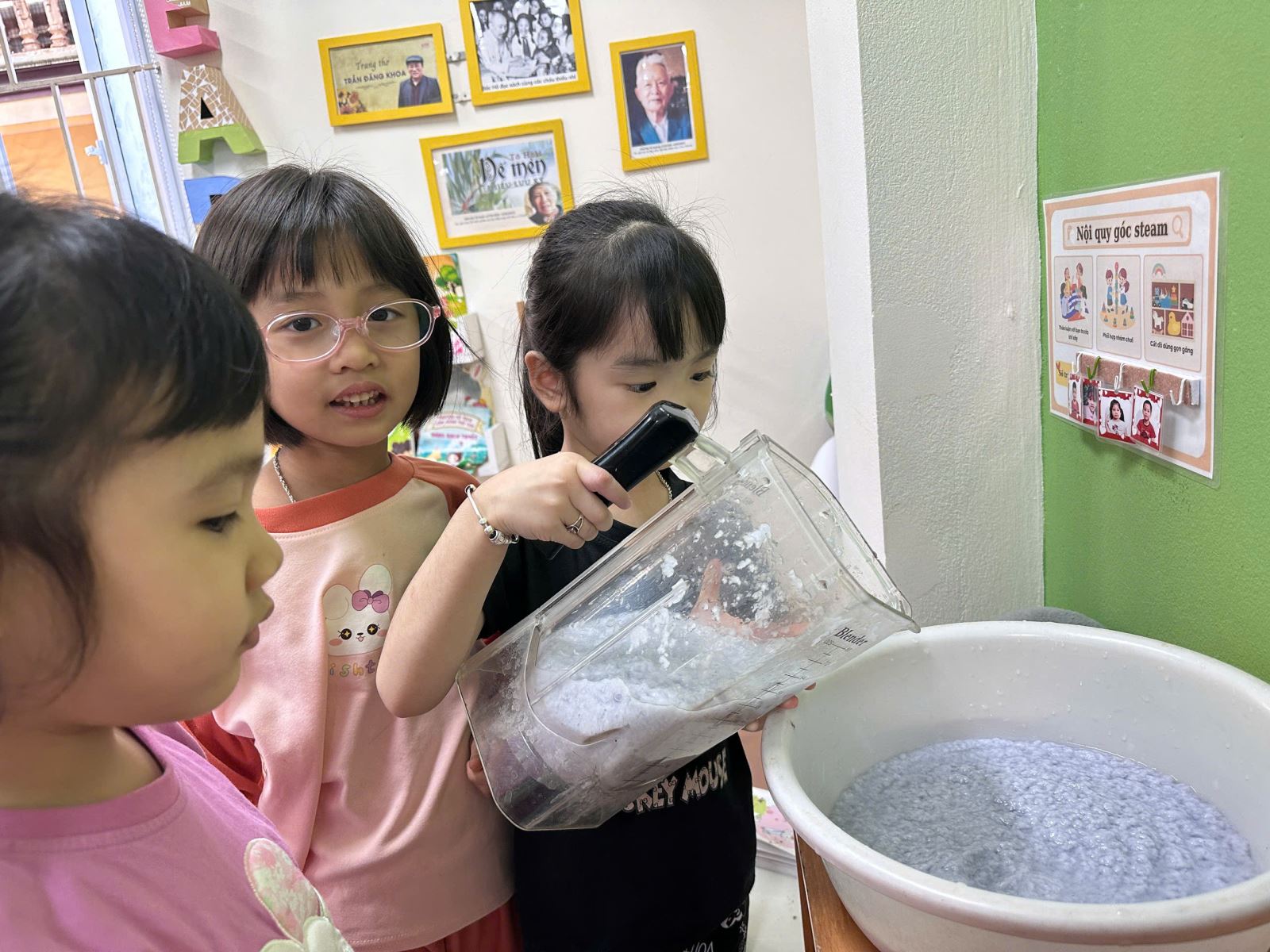 Sự tò mò của các con được đẩy lên cao trào khi chứng kiến những mẩu giấy cũ đã ngâm nước được cho vào máy xay sinh tố cùng với nước. Với sự hỗ trợ và giám sát tuyệt đối của cô giáo, máy xay bắt đầu hoạt động, biến những mảnh giấy thành một hỗn hợp bột giấy sền sệt. Đây chính là phần khoa học thú vị nhất, khi các con nhận ra giấy không hề "mất đi" mà chỉ biến đổi hình dạng!