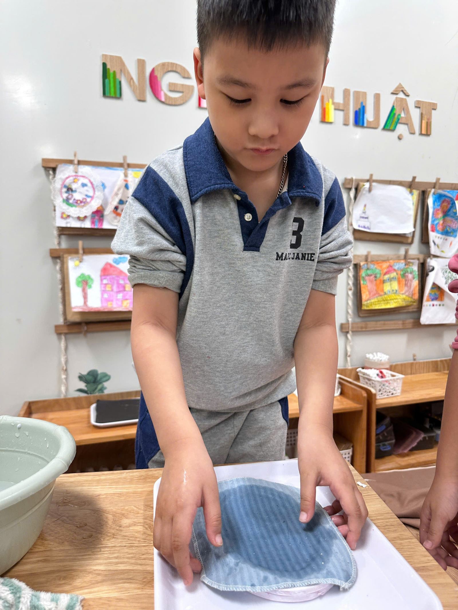 Sau khi có được hỗn hợp bột giấy, các bé được hướng dẫn cách dàn đều bột giấy lên khung lưới chuyên dụng. Với đôi tay nhỏ nhưng hết sức cẩn thận, các con đã ép nhẹ nhàng để loại bỏ phần nước thừa. Sau đó, từng tấm bột giấy đã ép được cẩn thận tách ra và đặt lên các tấm phên để mang ra khu vực có nắng phơi khô tự nhiên. Đây thực sự là khoảnh khắc mà các con được tận mắt thấy "phép màu" của quá trình tái chế, khi từ hỗn hợp bột nhão nhoét dần hình thành nên một tờ giấy mới!