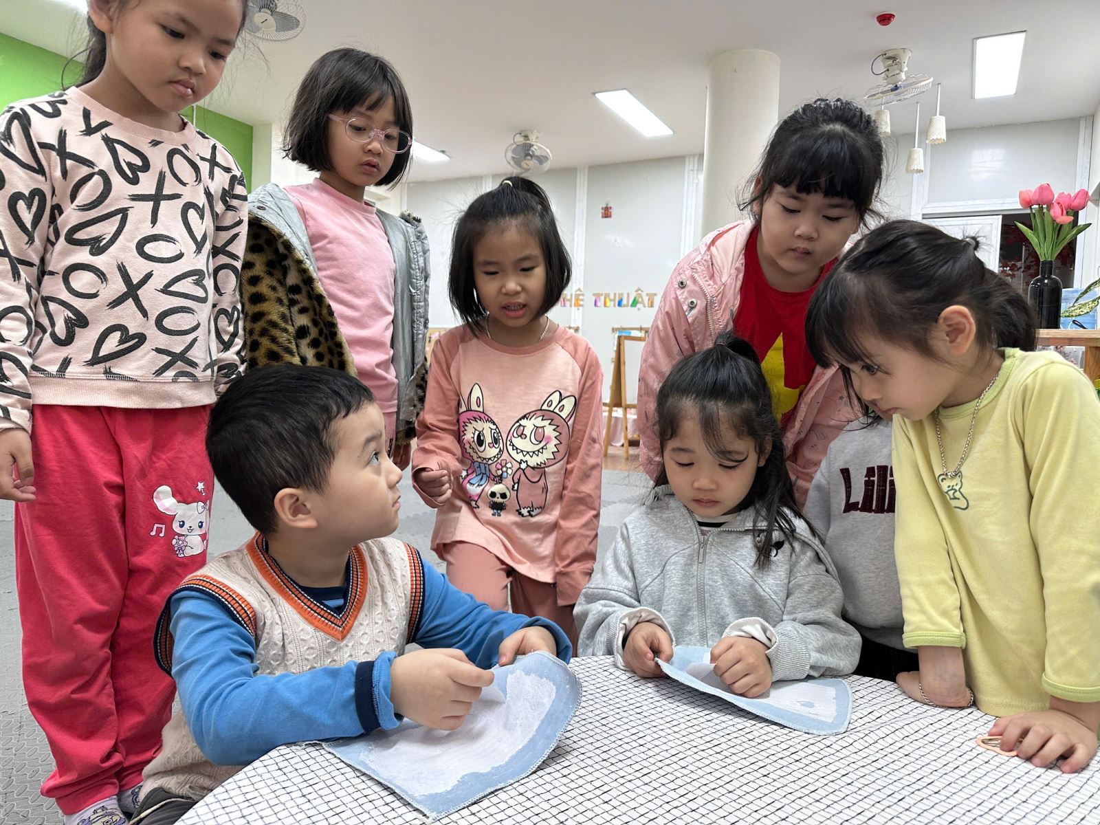Các nhà khoa học tí hon lớp mẫu giáo lớn A1 khám phá quy trình "Biến giấy cũ thành giấy mới" đầy thú vị