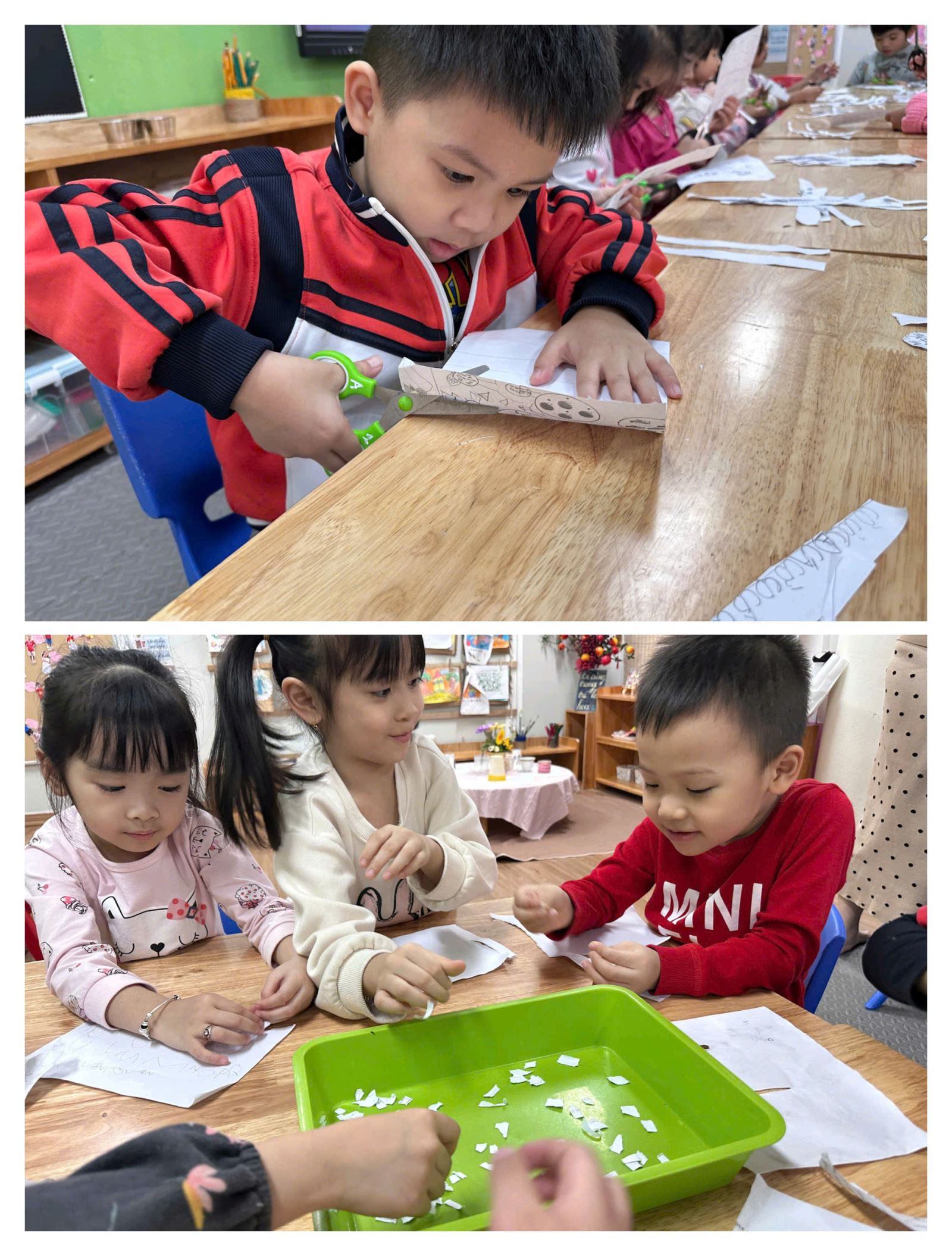 Các bé đã rất hào hứng khi được cô giáo hướng dẫn cách xé nhỏ những mẩu giấy vụn, giấy báo cũ thành những mảnh li ti. Đây là công đoạn đòi hỏi sự tỉ mỉ, giúp các con rèn luyện sự khéo léo của đôi bàn tay và tính kiên nhẫn. Một số bé còn được thử sức với việc dùng kéo cắt giấy, tạo thêm hứng thú cho hoạt động. Sau đó, những mảnh giấy nhỏ này được ngâm vào nước để làm mềm, sẵn sàng cho công đoạn tiếp theo.