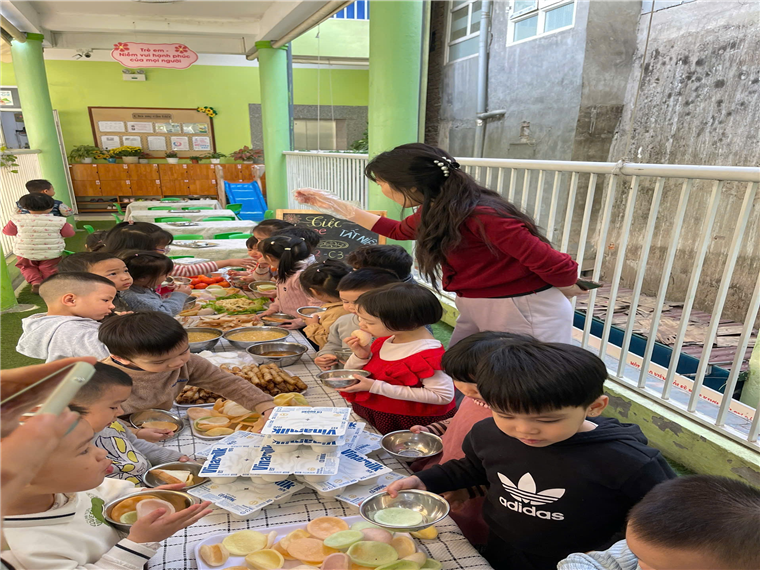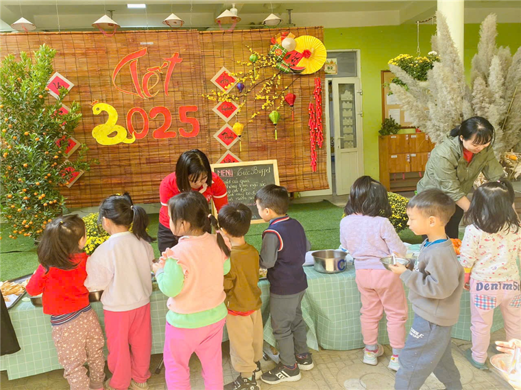 Đặc biệt nhà trường đã tổ chức cho các con liên hoan tiệc buffet, giúp các con cảm nhận rõ hơn hương vị của những món ăn thường có trong ngày tết. Qua đó, giáo dục trẻ có kỹ năng văn minh khi tham gia tiệc.