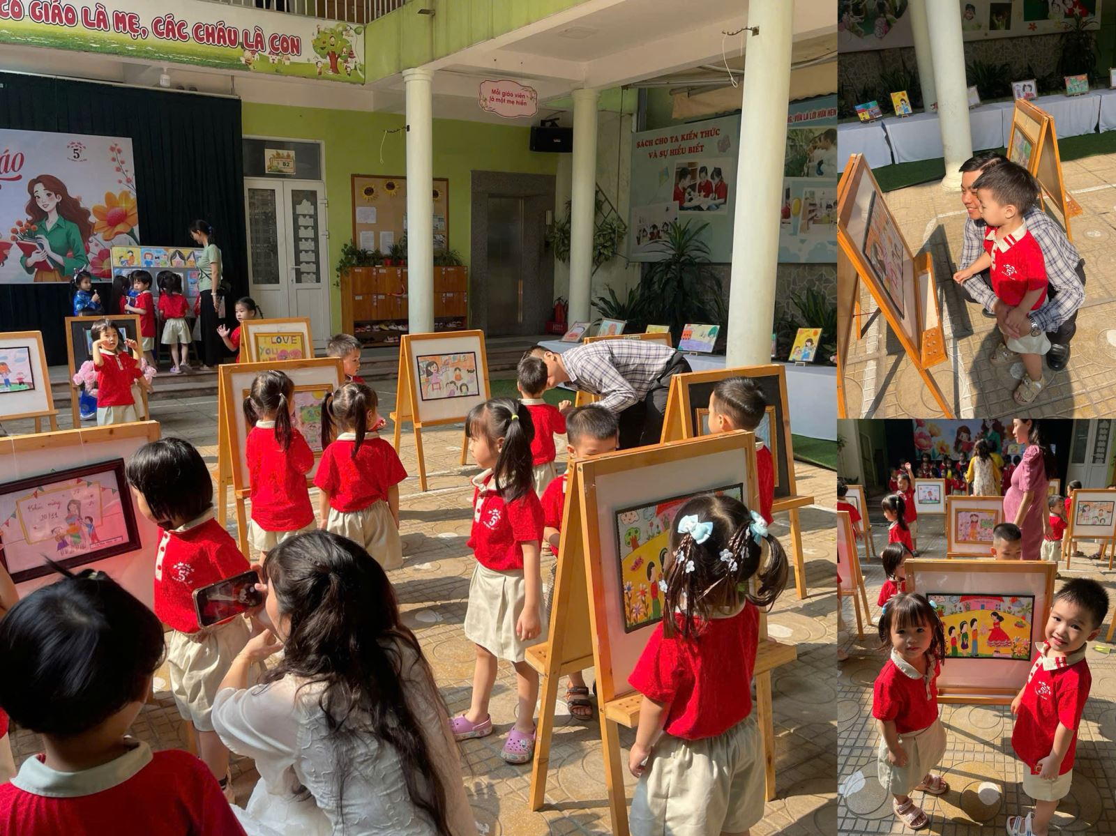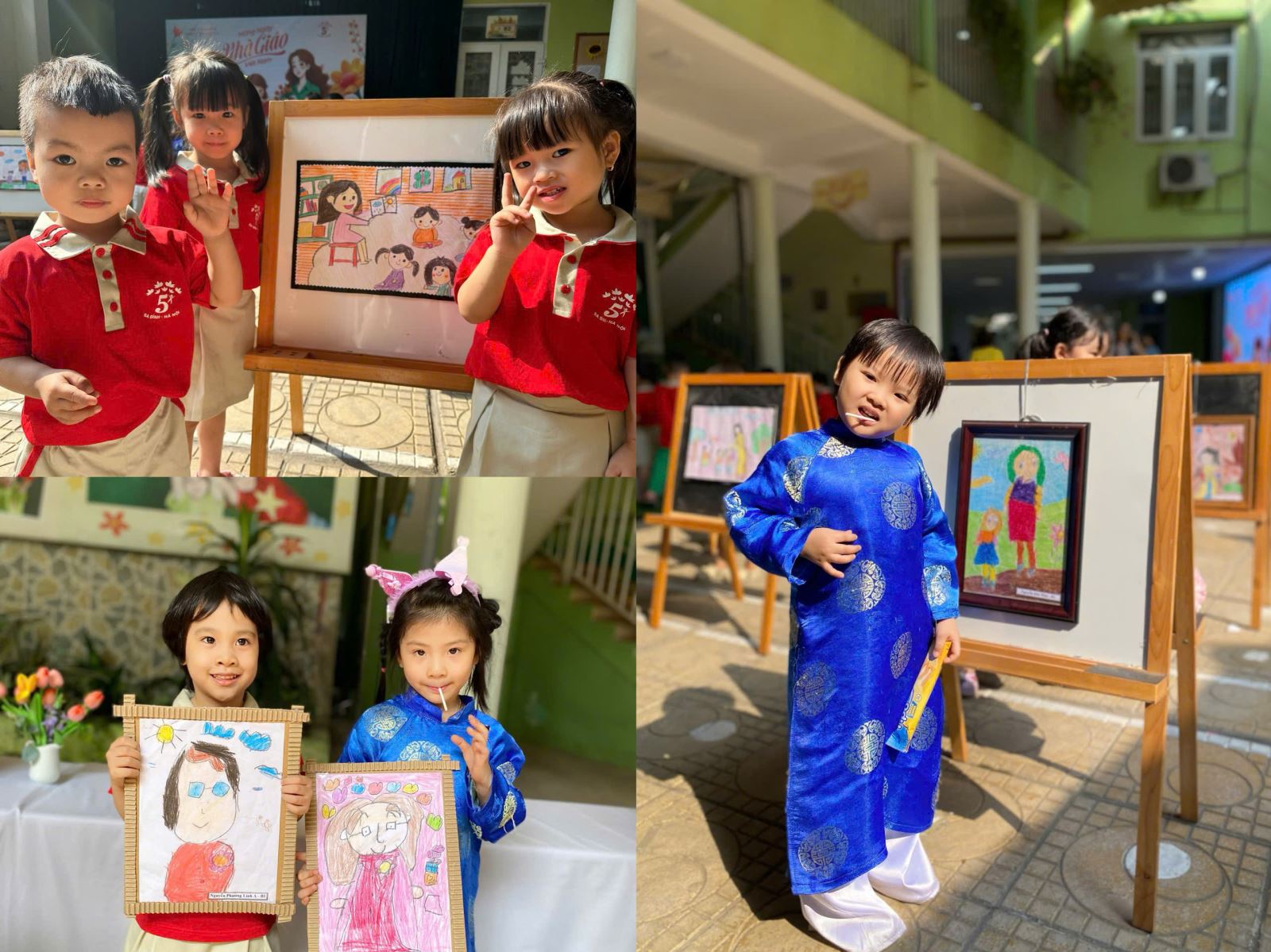 Bên cạnh đó các bức tranh do học sinh tự tay vẽ, tái hiện hình ảnh thầy cô dưới góc nhìn ngây thơ và sáng tạo của các em, được trưng bày trong khu vực triển lãm.