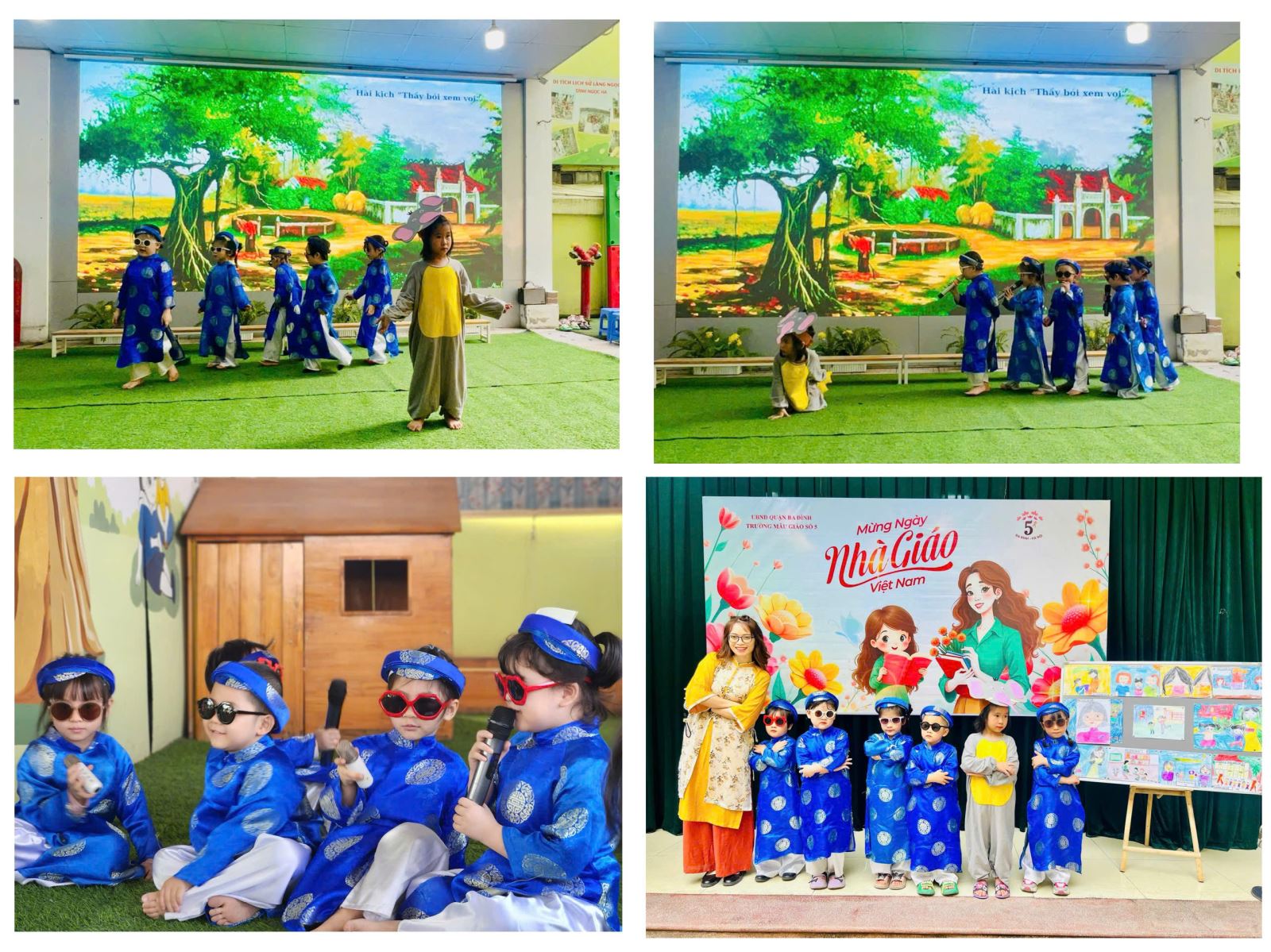 Một vở kịch ngắn hài hước, được chuyển thể từ câu chuyện ngụ ngôn nổi tiếng, do các con học sinh lớp Mẫu giáo nhỡ B1 biểu diễn. Vở kịch kể về câu chuyện của năm thầy bói mù cùng nhau “xem voi” và đưa ra những nhận định khác nhau dựa trên phần con voi họ chạm vào. Từ đó, câu chuyện nhắn nhủ thông điệp về tầm quan trọng của cái nhìn toàn diện và sự đoàn kết. Qua vở kịch, học sinh không chỉ mang lại tiếng cười mà còn truyền tải bài học sâu sắc về sự học hỏi, thấu hiểu – điều mà thầy cô luôn nhắc nhở các em trong quá trình học tập.