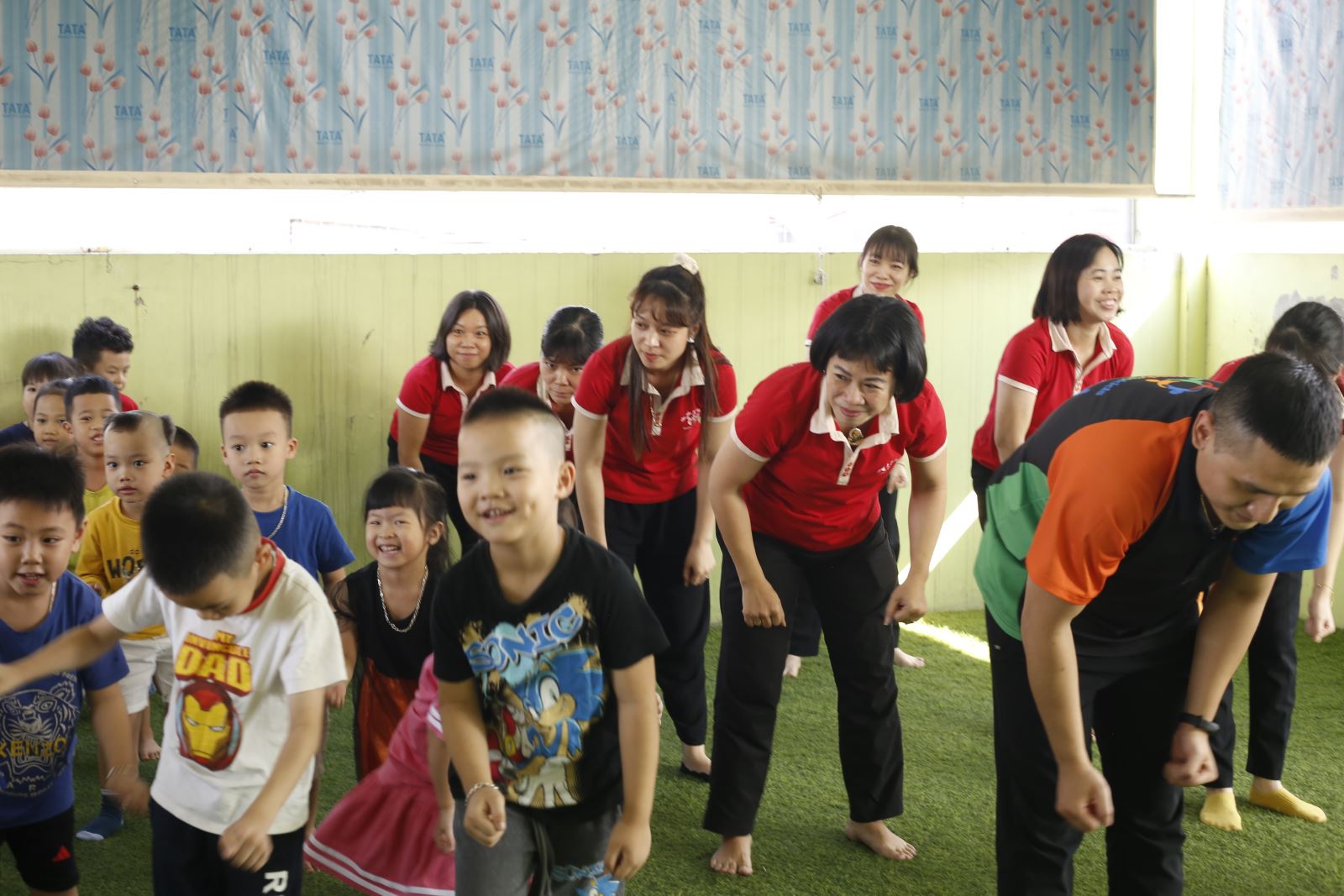Buổi chiều, các giáo viên được chia thành các nhóm để thực hành và xây dựng các hoạt động vận động cho trẻ. Các nhóm đã sáng tạo ra nhiều hoạt động vận động phong phú như: đi dích dắc, ném trúng đích; đóng vai các con vật trong rừng nhảy vào đúng màu và bò cao; đi qua cầu, giải cứu cá... và các bài tập thể dục vui nhộn. Mỗi hoạt động không chỉ giúp trẻ phát triển khả năng vận động mà còn khuyến khích tinh thần đồng đội, sự sáng tạo và khả năng giải quyết vấn đề.