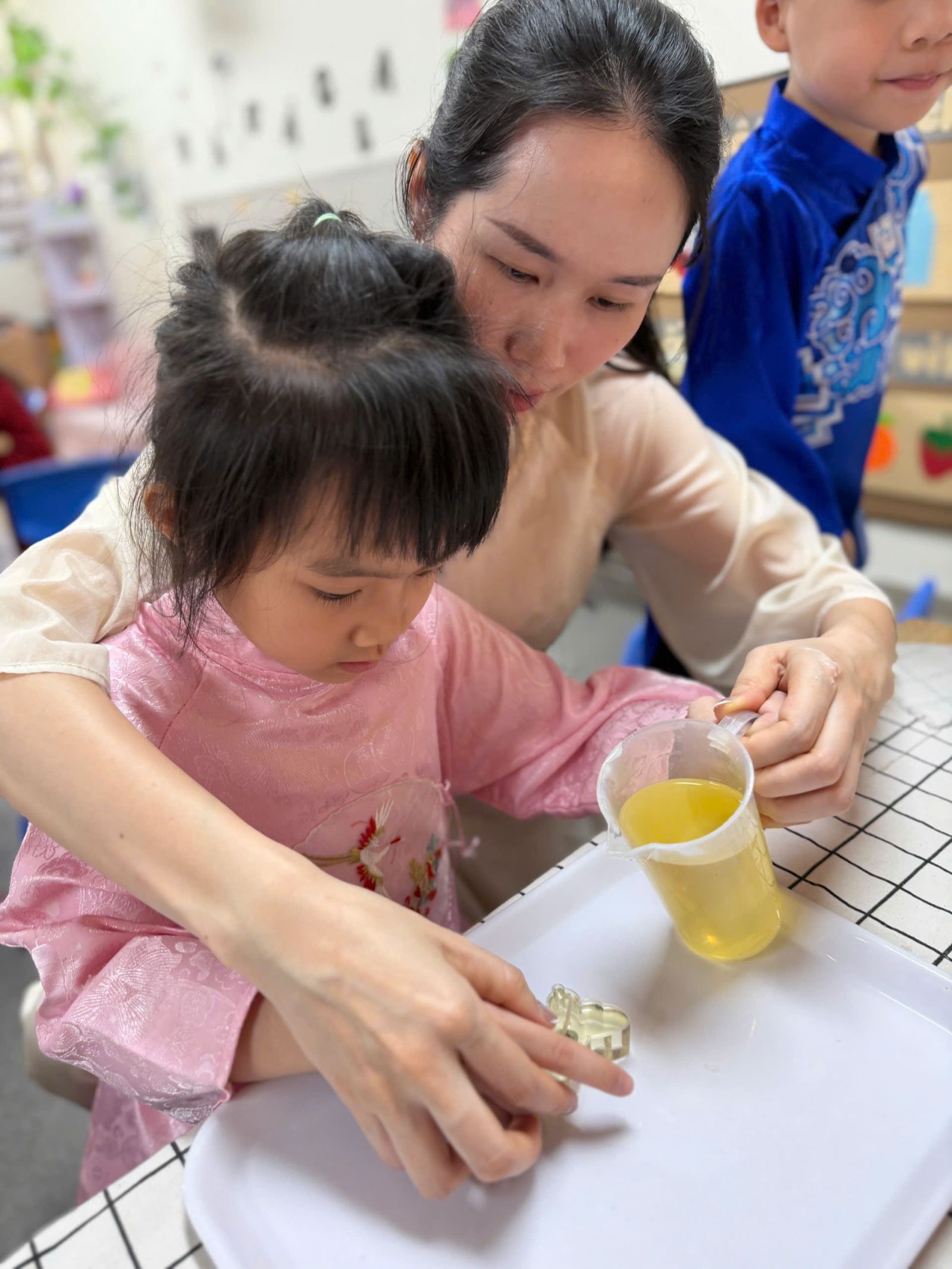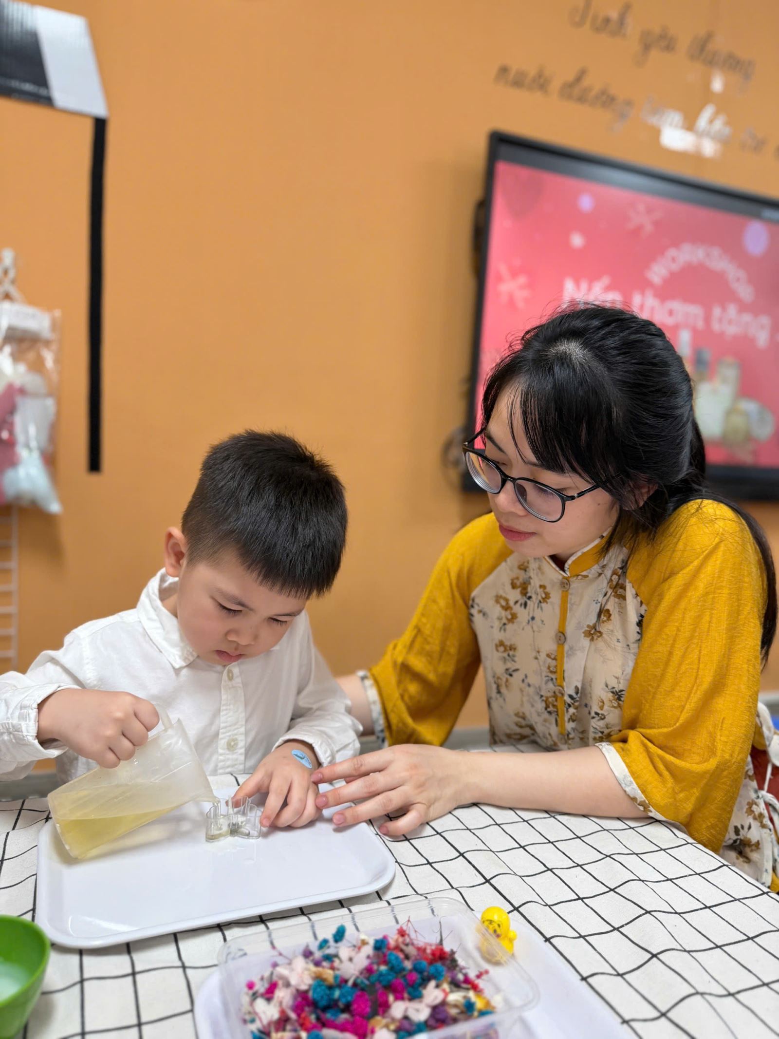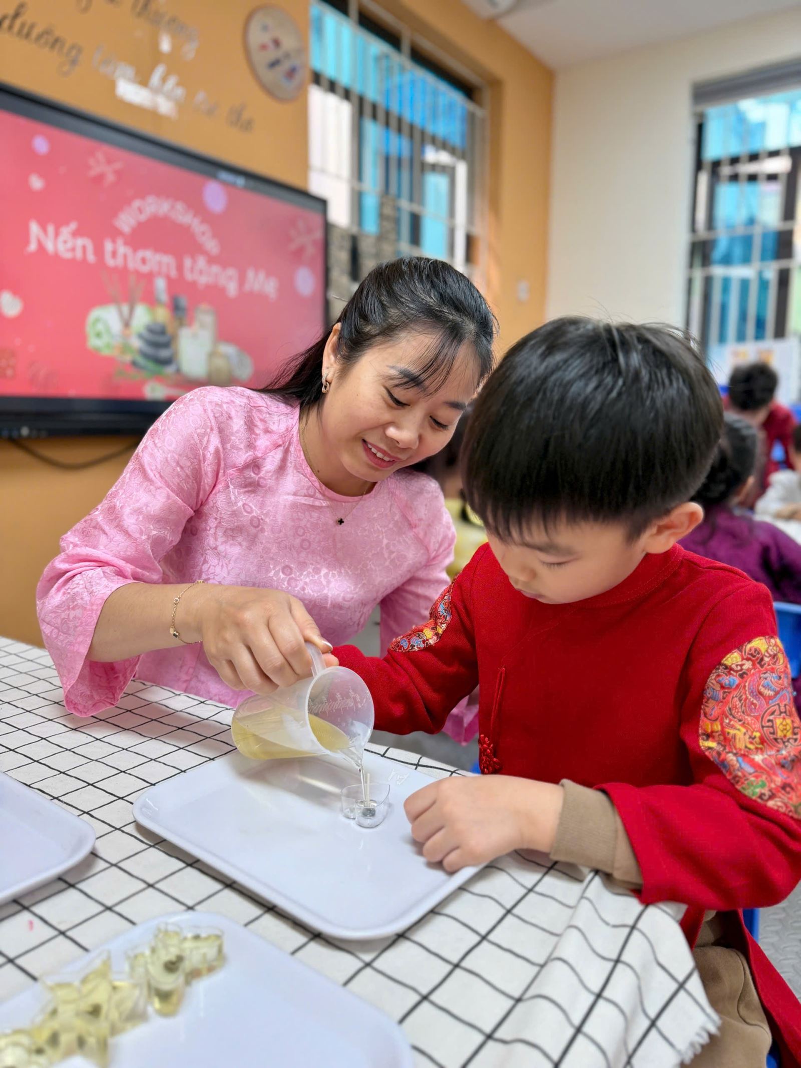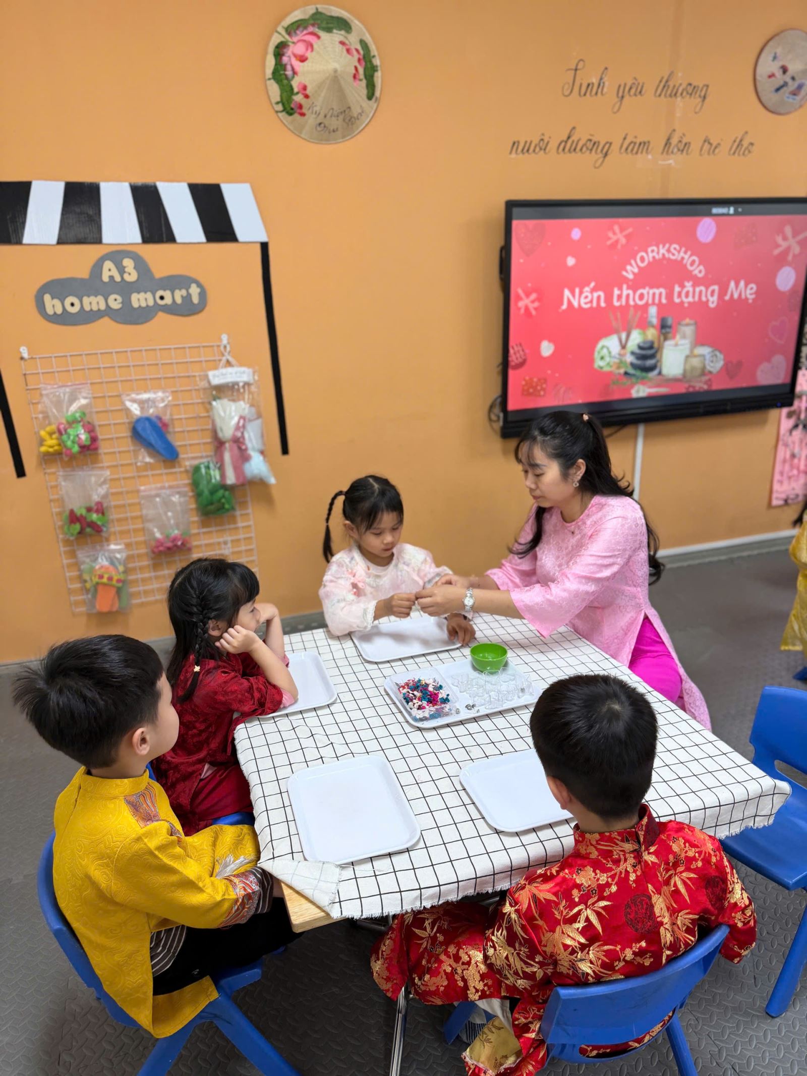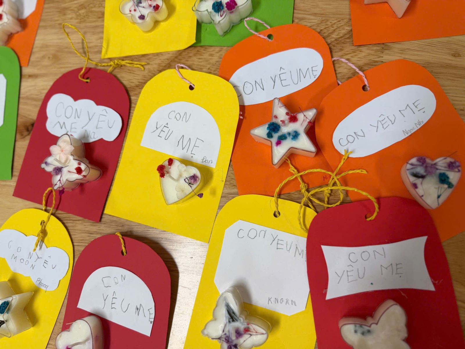 Nhưng có lẽ, điều khiến món quà này trở nên vô giá nhất chính là những tấm thiệp đầy màu sắc đi kèm. Trên những tấm thiệp đỏ, vàng, cam rực rỡ, các bạn nhỏ đã tự tay nắn nót viết lên những dòng chữ chân thành nhất: "CON YÊU MẸ".