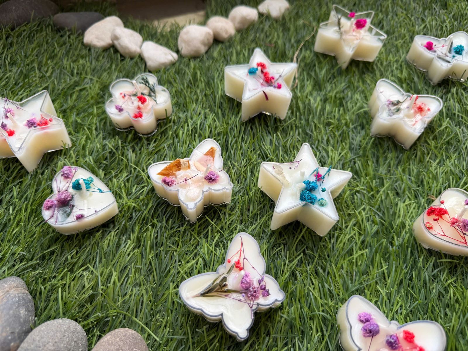 Sau một buổi tỉ mỉ làm việc, thành quả thu được là một khay nến thơm vô cùng rực rỡ với đủ các hình dáng đáng yêu: từ hình trái tim, ngôi sao năm cánh, bông hoa cho đến những chú bươm bướm xinh xắn.