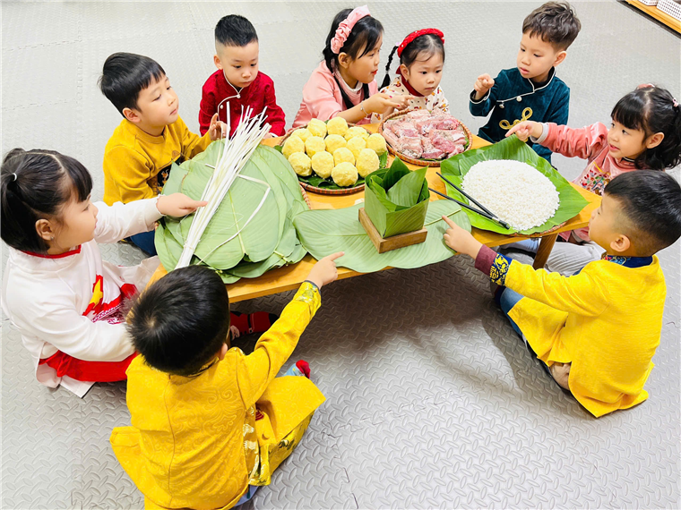 Trẻ cùng nhau khám phá nguyên liệu làm bánh chưng
