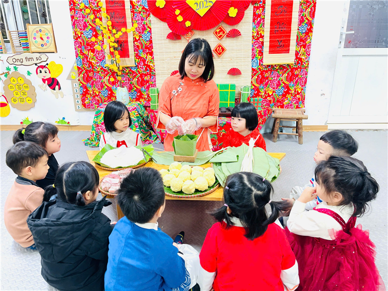 Dưới sự hướng dẫn và giúp đỡ của cô giáo, những bàn tay nhỏ bé của các con đã làm được chiếc bánh chưng. Trẻ rất hào hứng khi được tham gia các hoạt động trải nghiệm tại lớp.