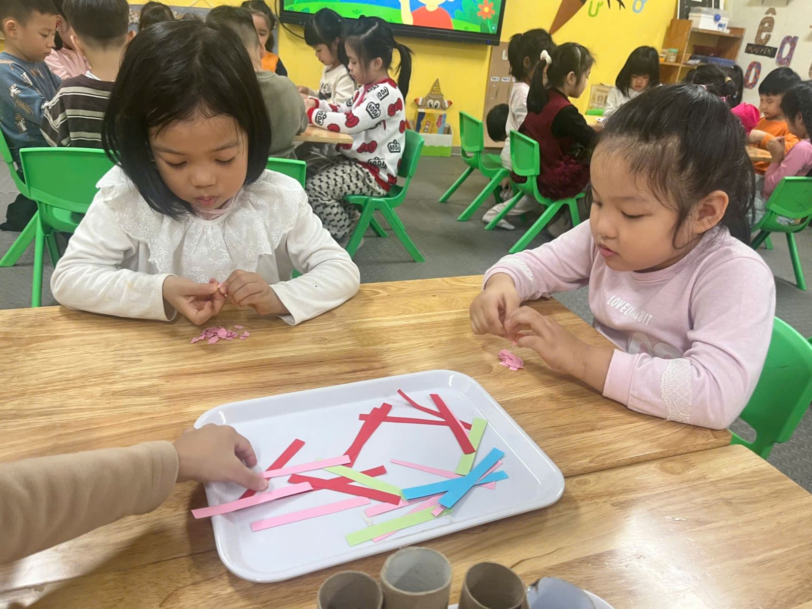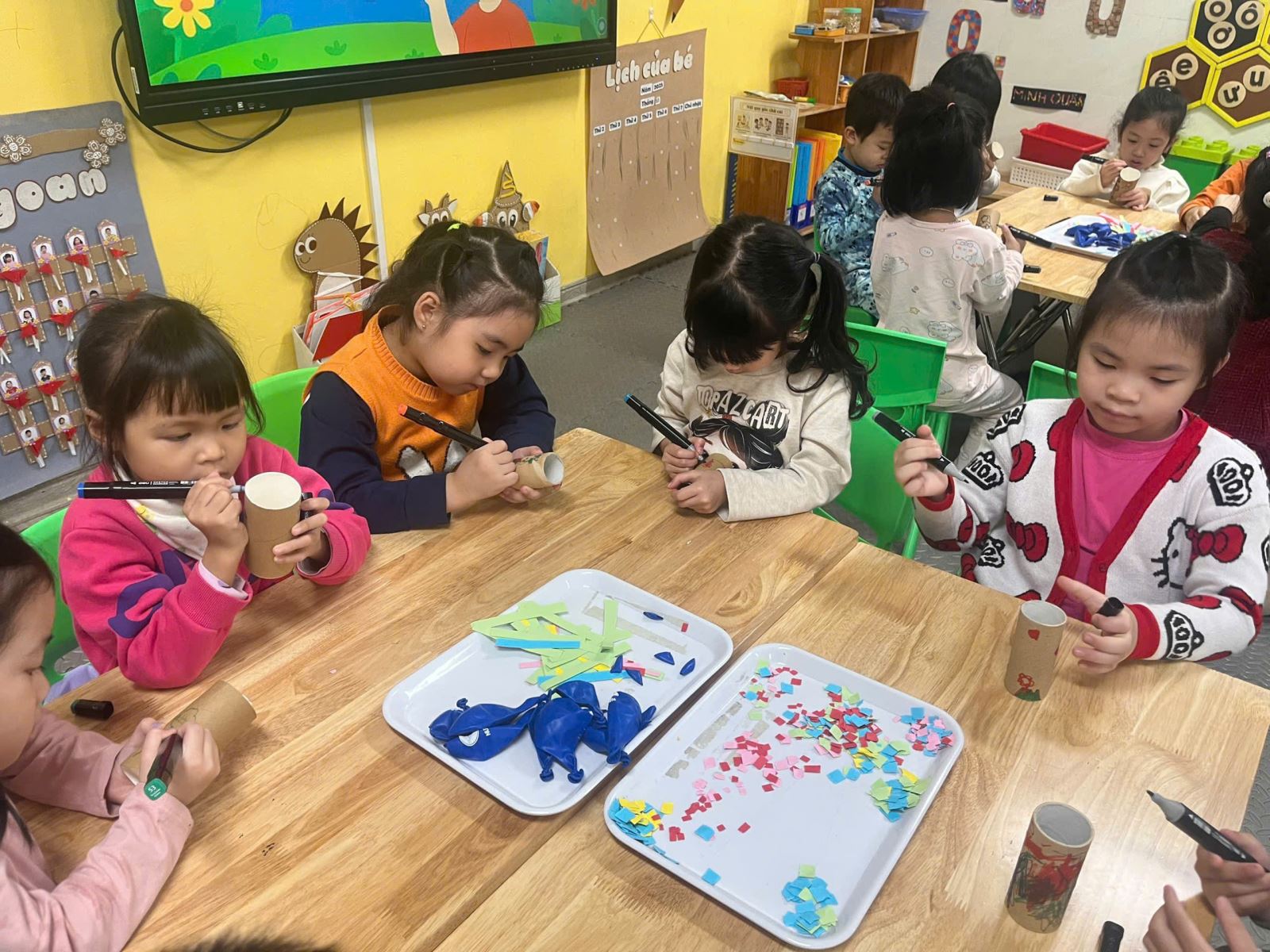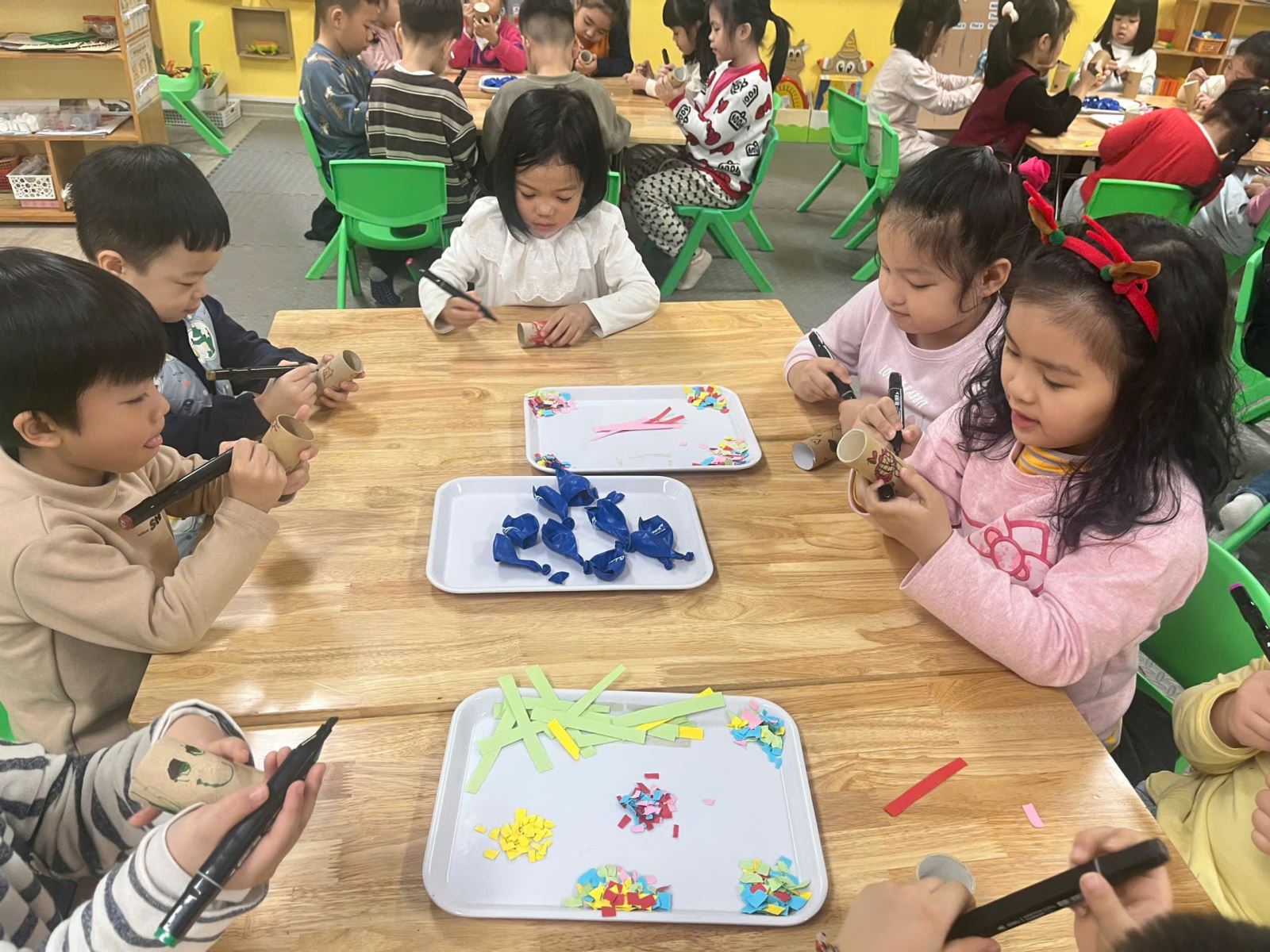 Hoạt động không chỉ giúp các con rèn luyện sự khéo léo của đôi tay, phát triển óc sáng tạo mà còn mang lại không khí học tập vui tươi, hào hứng. Những nguyên vật liệu tái chế tưởng chừng đơn giản đã trở thành đồ chơi độc đáo dưới bàn tay tài năng của các bạn nhỏ A2.