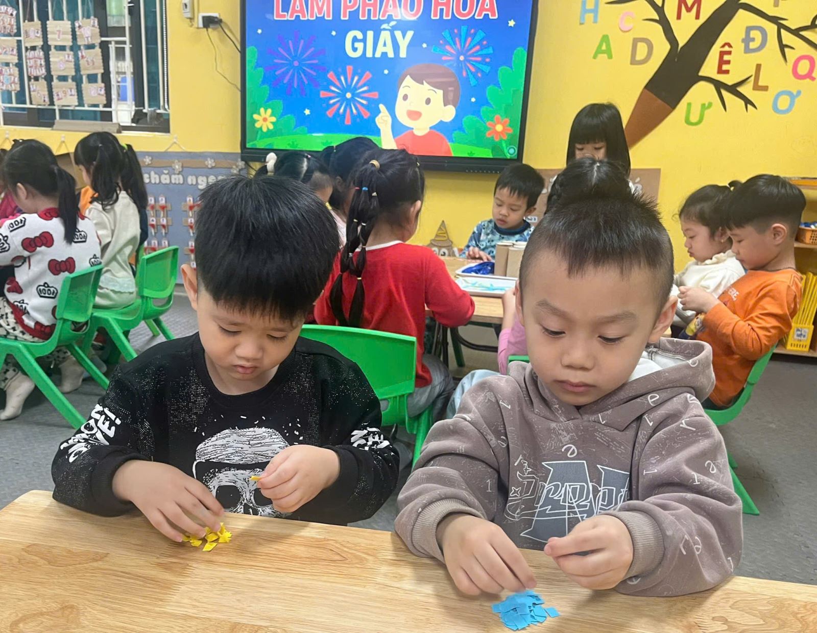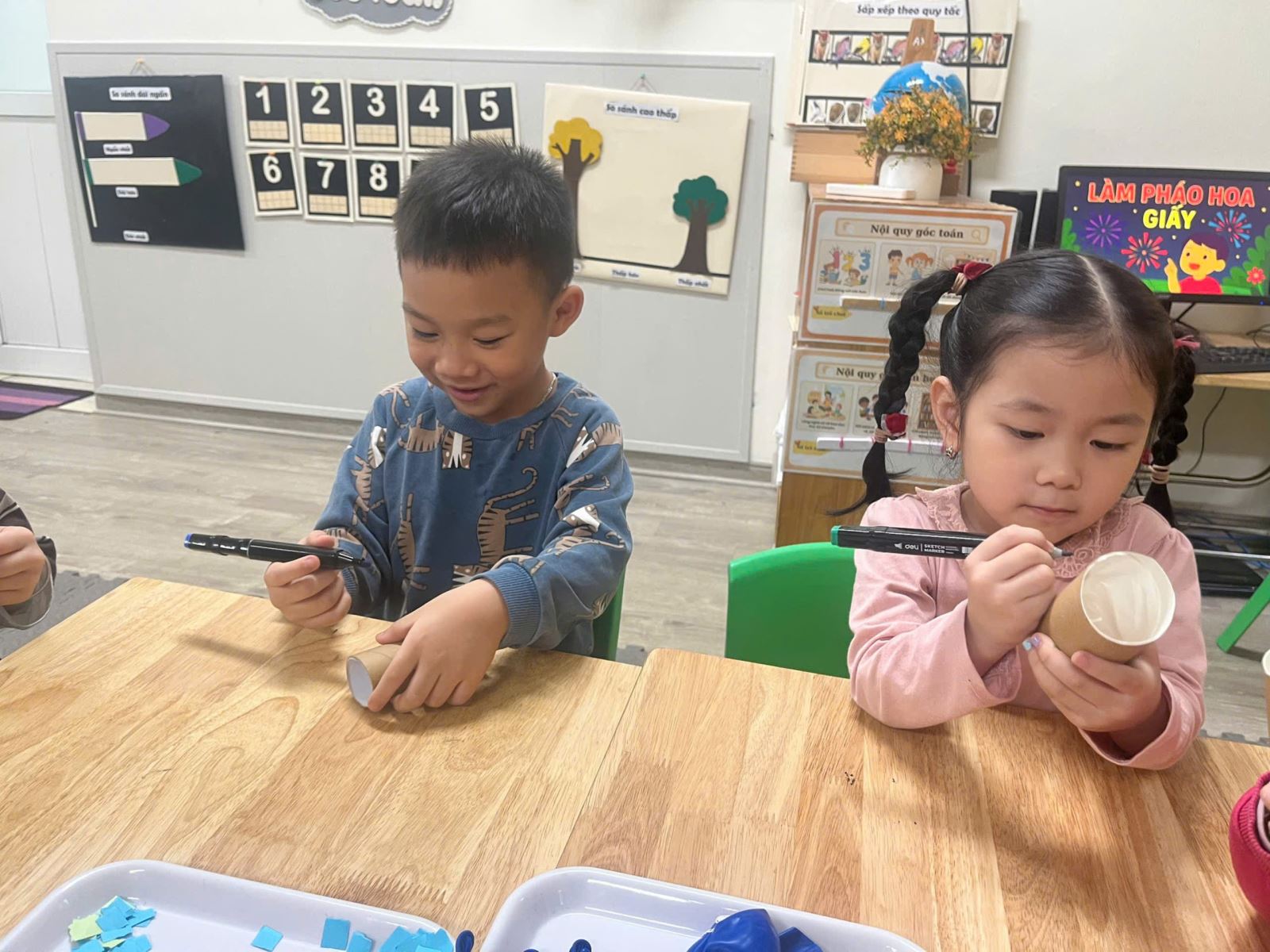 Sau khi trang trí xong, các bé khéo léo gắn bóng bay vào lõi giấy và xé bìa màu thành những sợi nhỏ để làm “tia pháo hoa”. Khi hoàn thành sản phẩm, bé nào cũng háo hức thử “bắn pháo hoa” của riêng mình, gương mặt rạng rỡ đầy niềm vui.