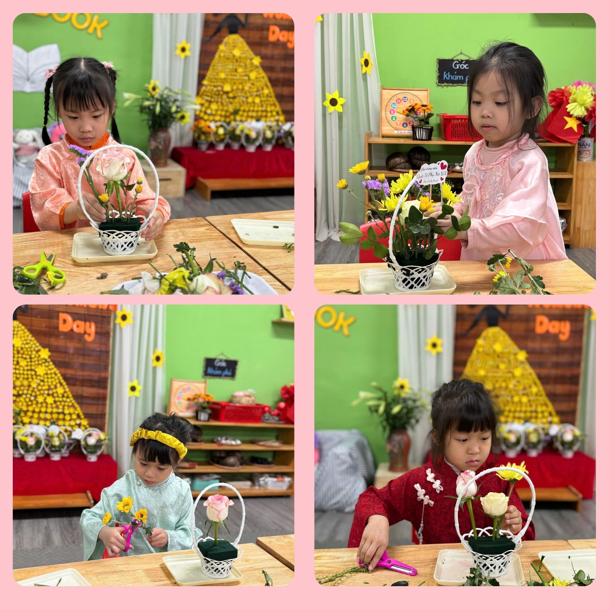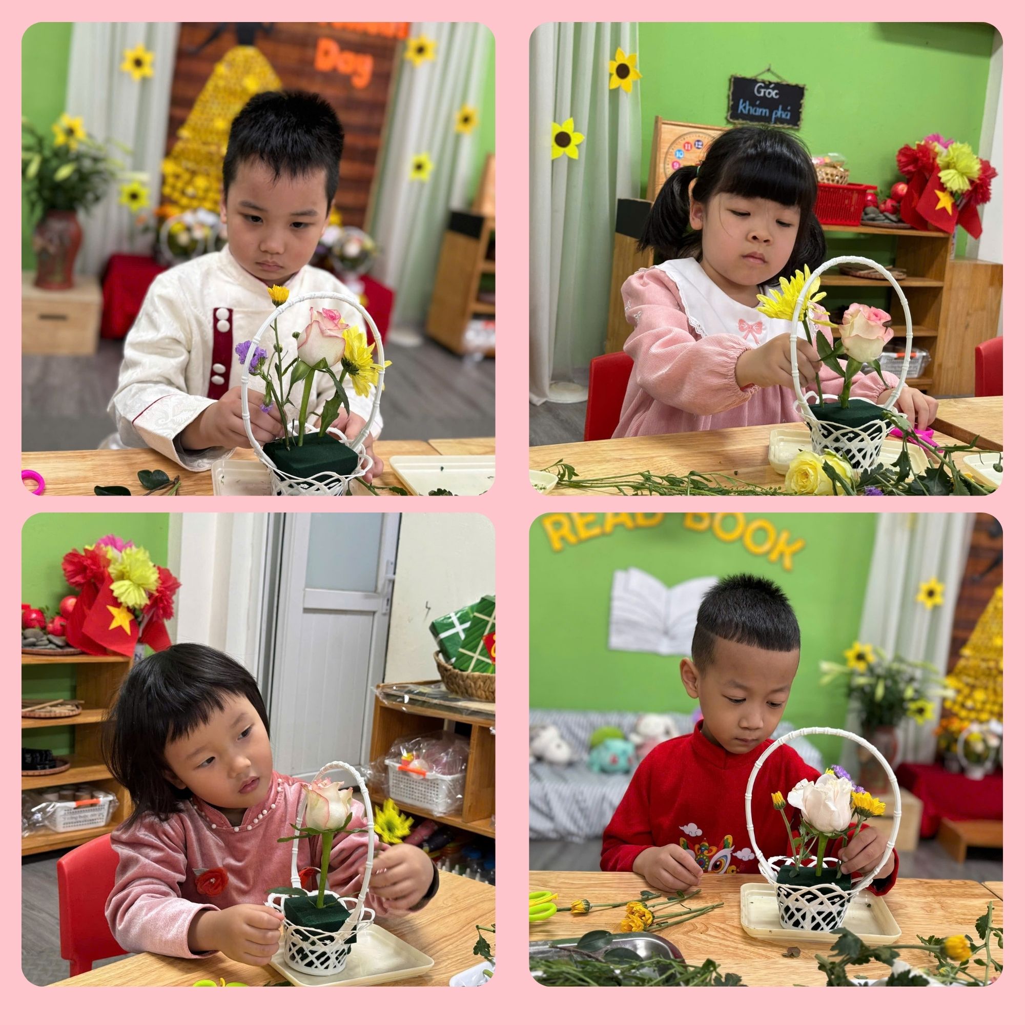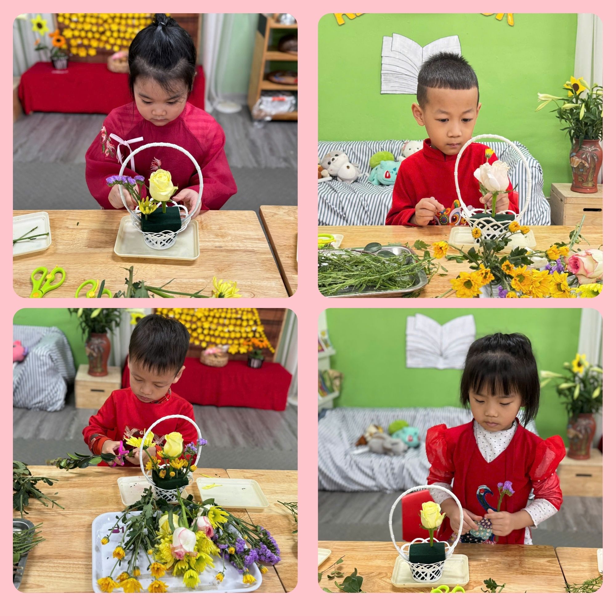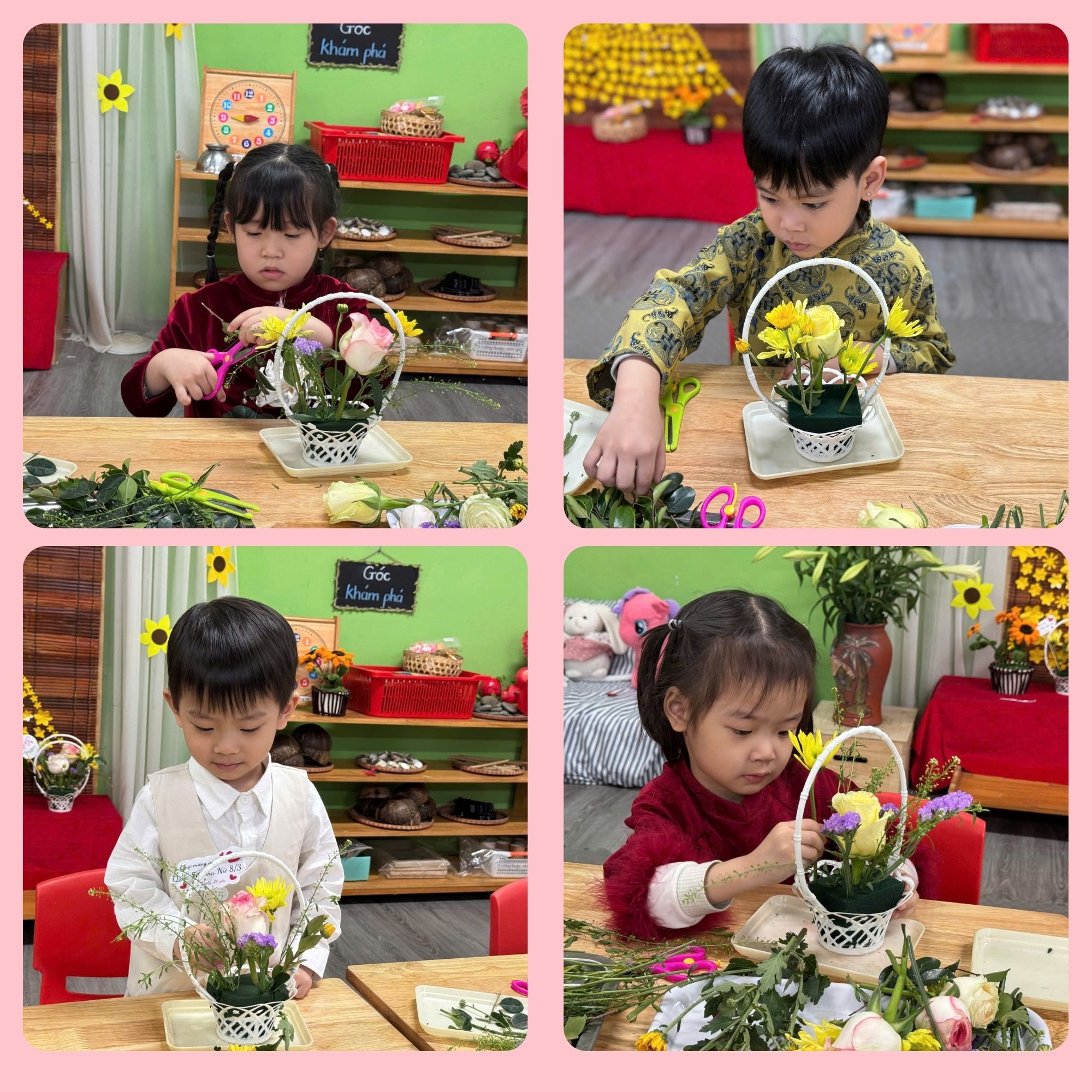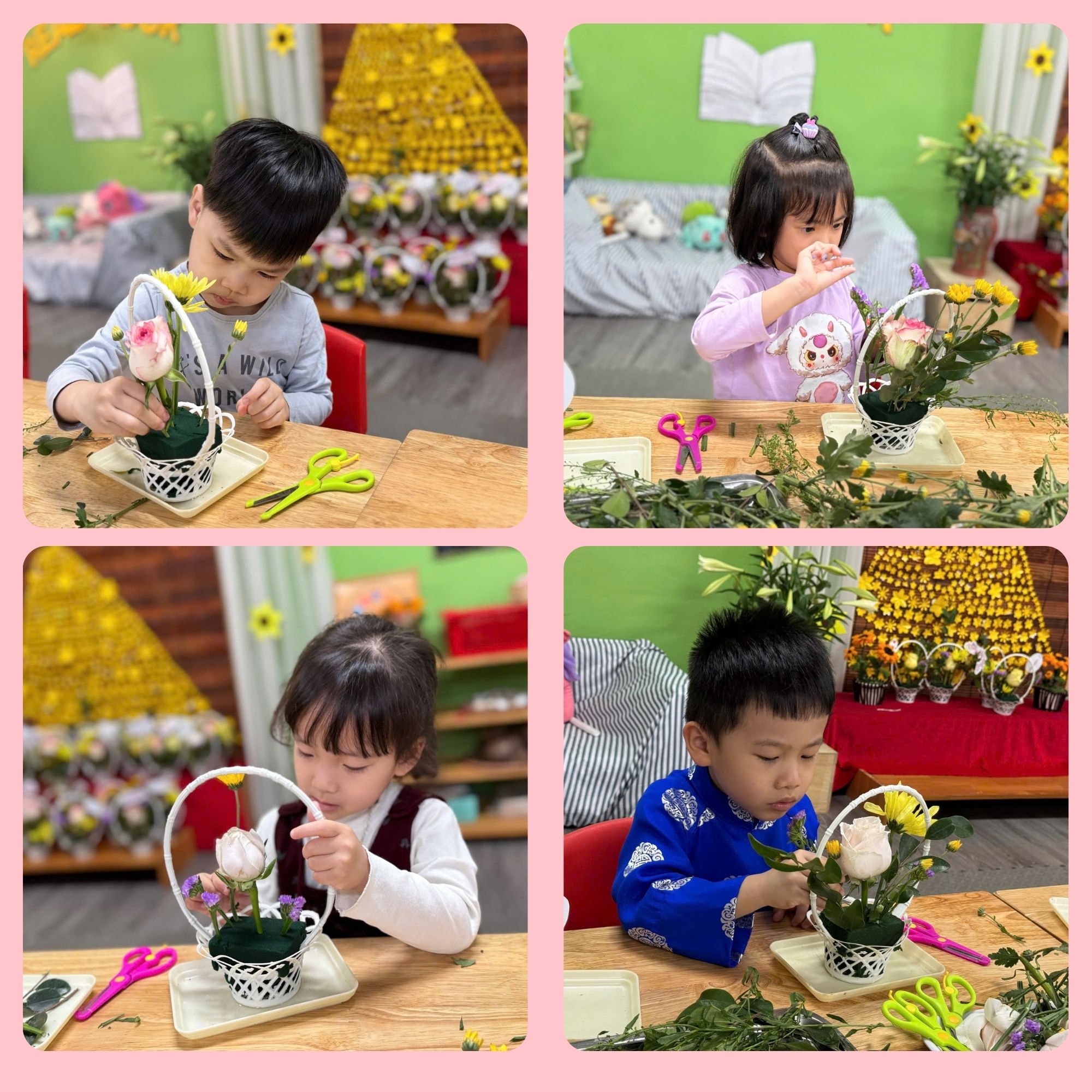 Dưới sự hướng dẫn của cô giáo, các bé được tự tay lựa chọn những bông hoa tươi xinh, dùng kéo cắt cành và khéo léo cắm vào những chiếc giỏ nhỏ đáng yêu. Mỗi bạn đều rất tập trung, tỉ mỉ để hoàn thành “tác phẩm” của riêng mình. Những giỏ hoa nhỏ xinh với nhiều màu sắc rực rỡ đã dần được hoàn thiện từ đôi bàn tay bé nhỏ nhưng vô cùng khéo léo.