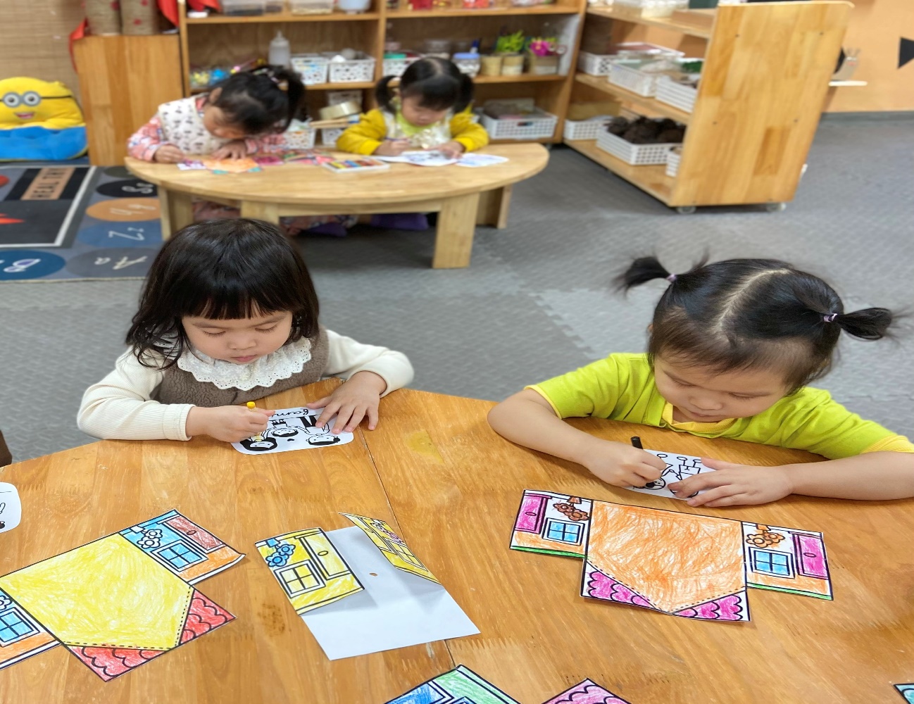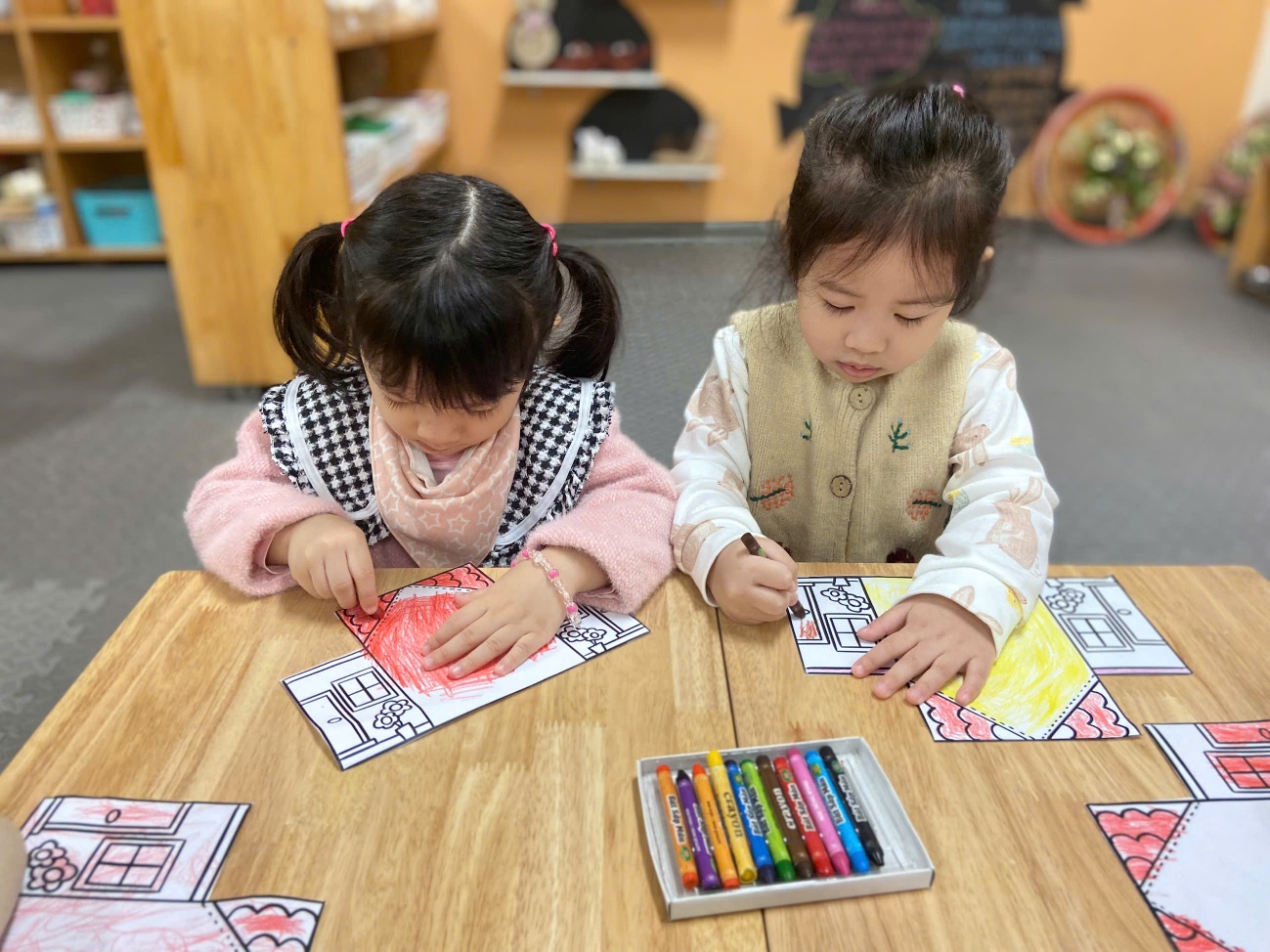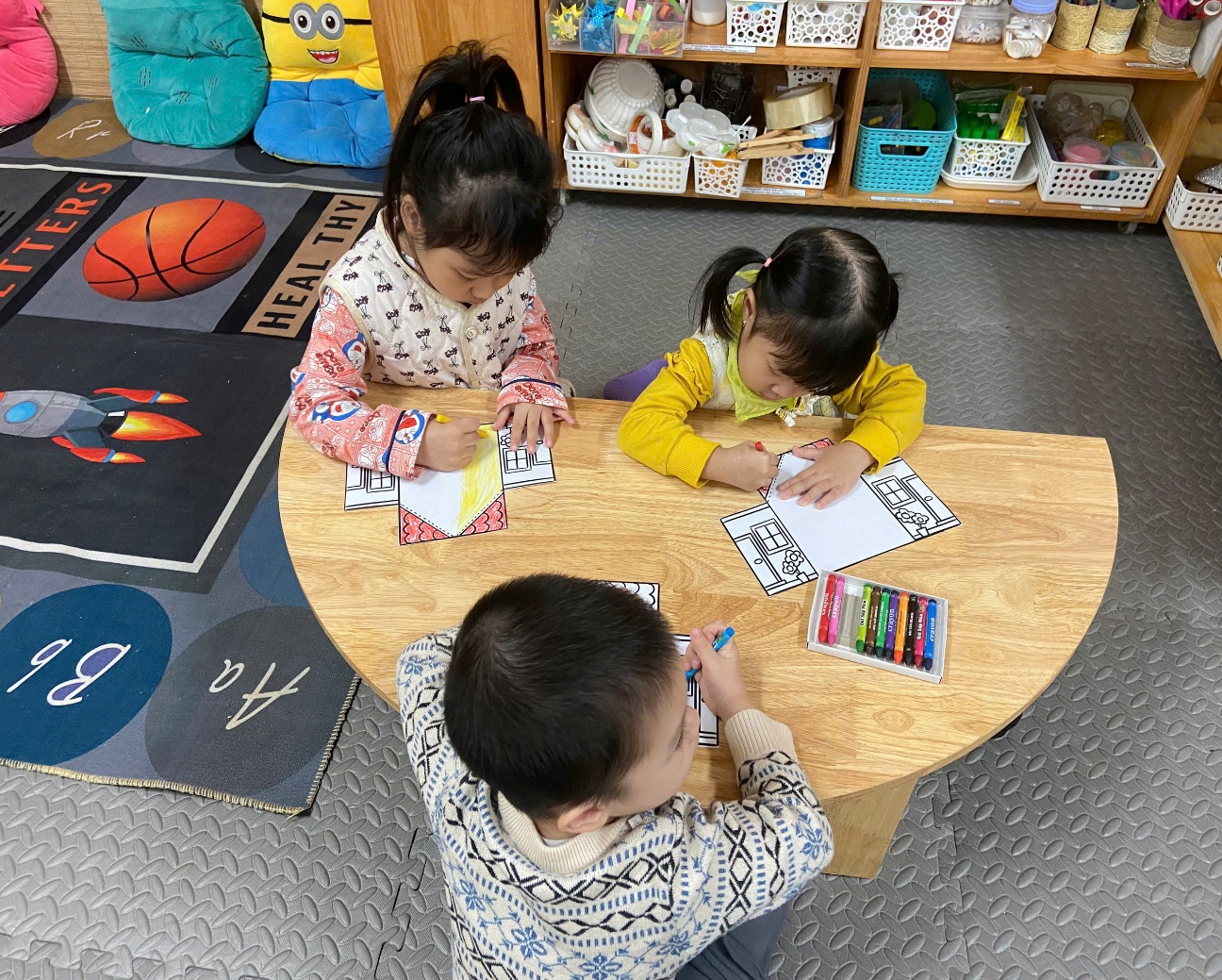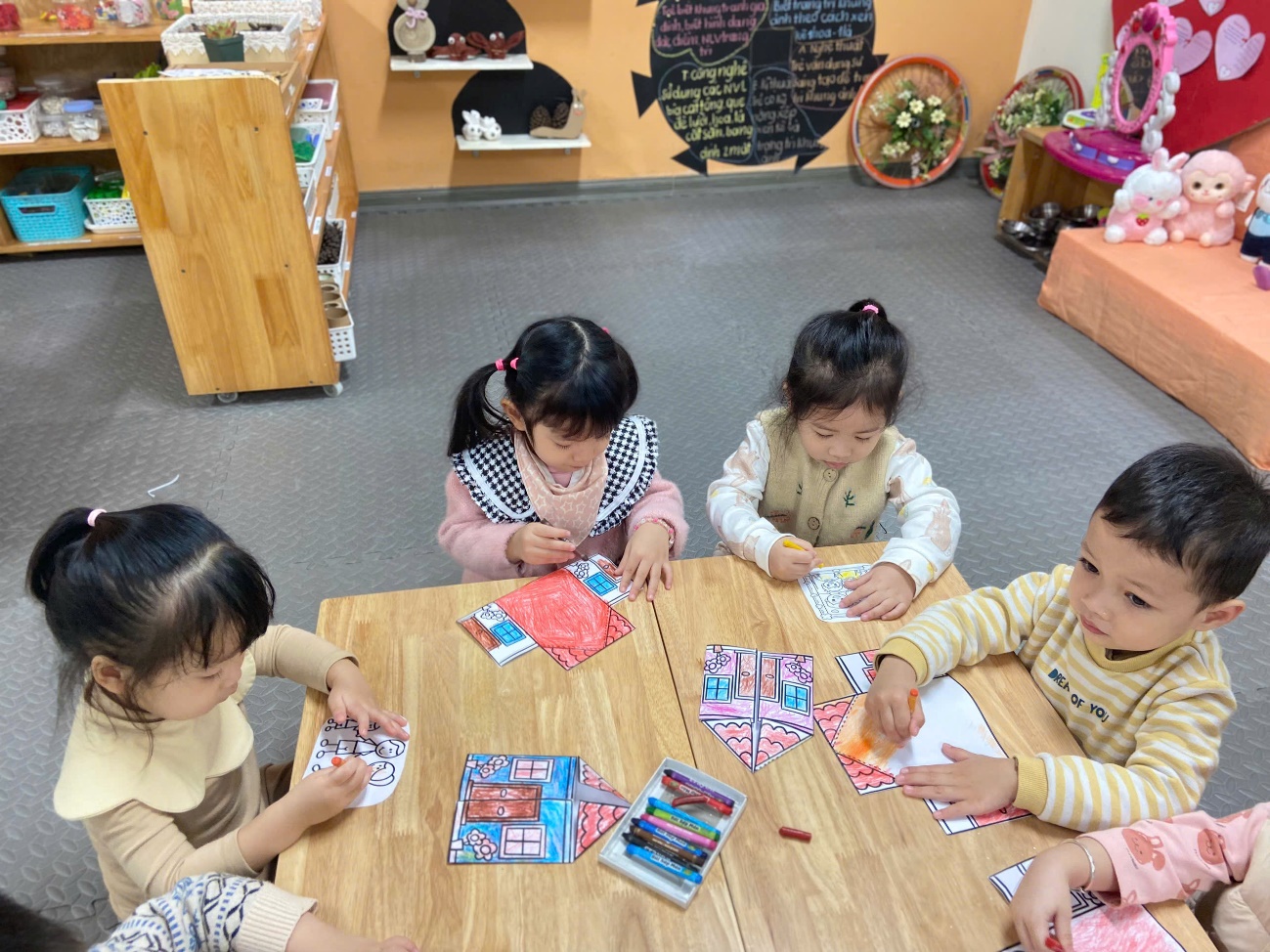 Khơi gợi tình cảm yêu thương, sự gắn bó của bé đối với gia đình. Khuyến khích trẻ mạnh dạn chia sẻ về ngôi nhà và những người thân yêu. Các bé hào hứng chọn màu, tạo nên những ngôi nhà rực rỡ, đáng yêu. Bé tập tô các chi tiết như mái nhà, cửa ra vào, cửa sổ và hình ảnh bố mẹ, ông bà, anh chị… Sau khi hoàn thành, nhiều bạn còn tự tin chia sẻ tranh của mình với cô và các bạn.
