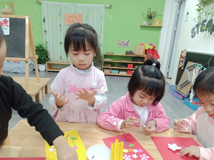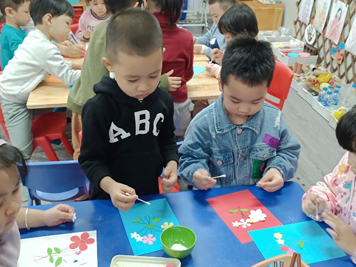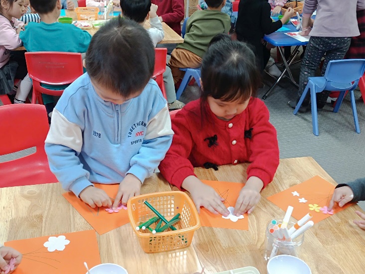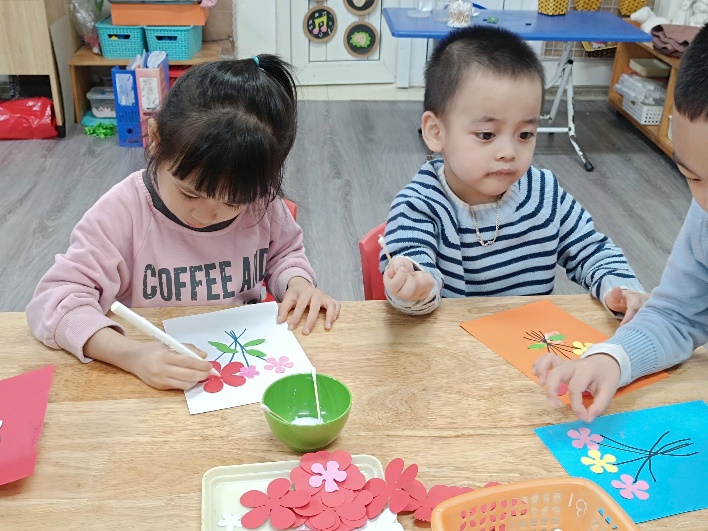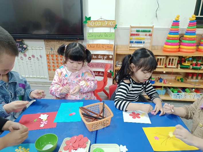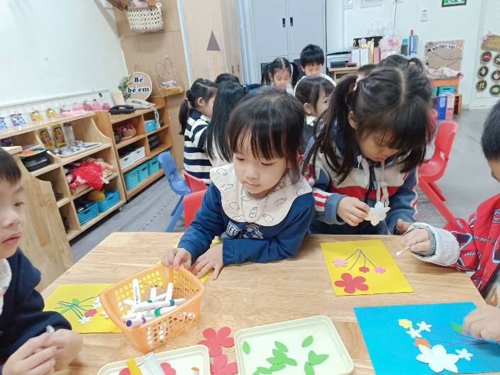 Trong hoạt động, mỗi bạn được tự tay sáng tạo những tấm bưu thiếp xinh xắn. Các con sử dụng nhiều bông hoa to – nhỏ đủ màu sắc, kết hợp cùng lá cây được cắt dán tỉ mỉ. Trên nền bưu thiếp, các con còn khéo léo vẽ thêm những cành hoa tạo nên bố cục hài hòa và sinh động.
