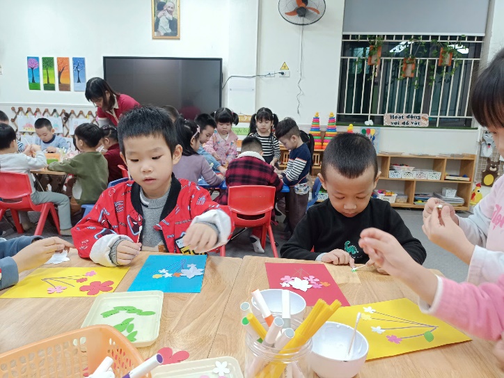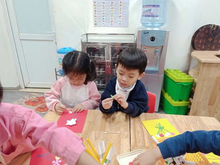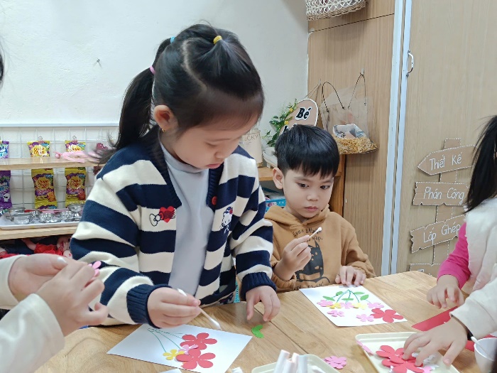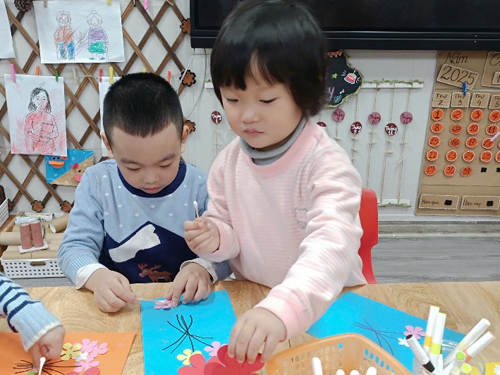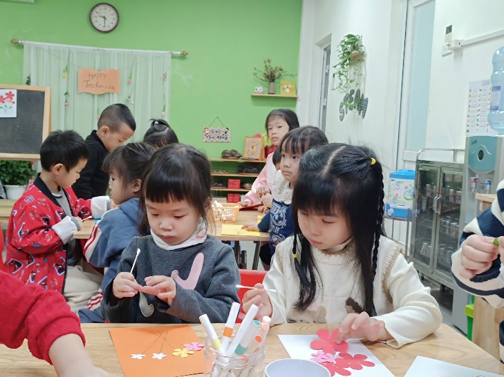 Nhờ đôi bàn tay nhỏ nhắn nhưng khéo léo và sự tưởng tượng phong phú, mỗi tấm thiệp đều trở thành một tác phẩm riêng biệt, chứa đựng lời chúc yêu thương của các con gửi tới các cô. Hoạt động không chỉ giúp trẻ rèn luyện kỹ năng tạo hình, sự kiên trì và sáng tạo, thẩm mỹ, mà còn nuôi dưỡng trong các con tình cảm biết ơn – một giá trị đẹp được gìn giữ trong môi trường học.