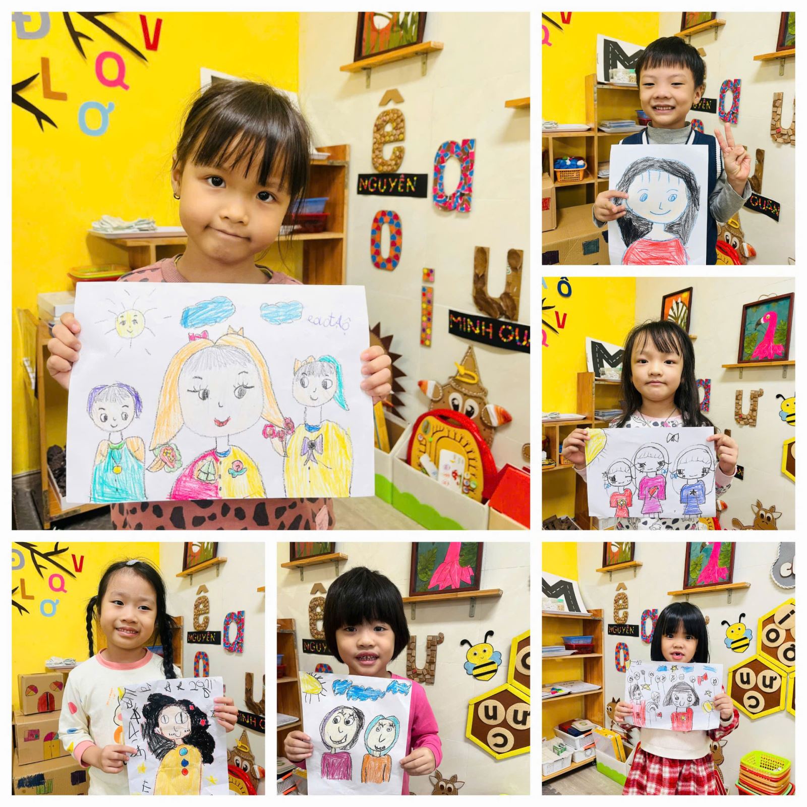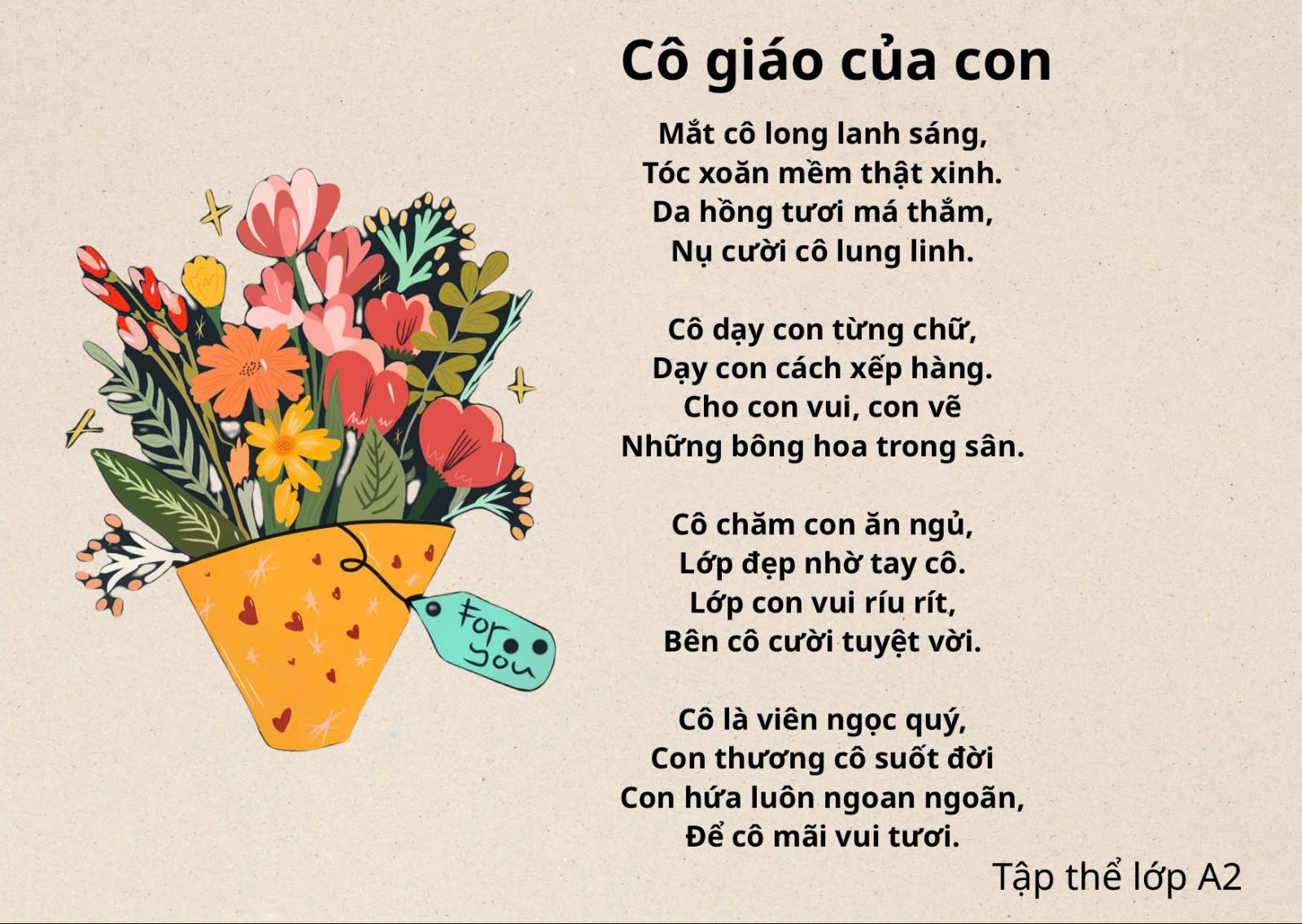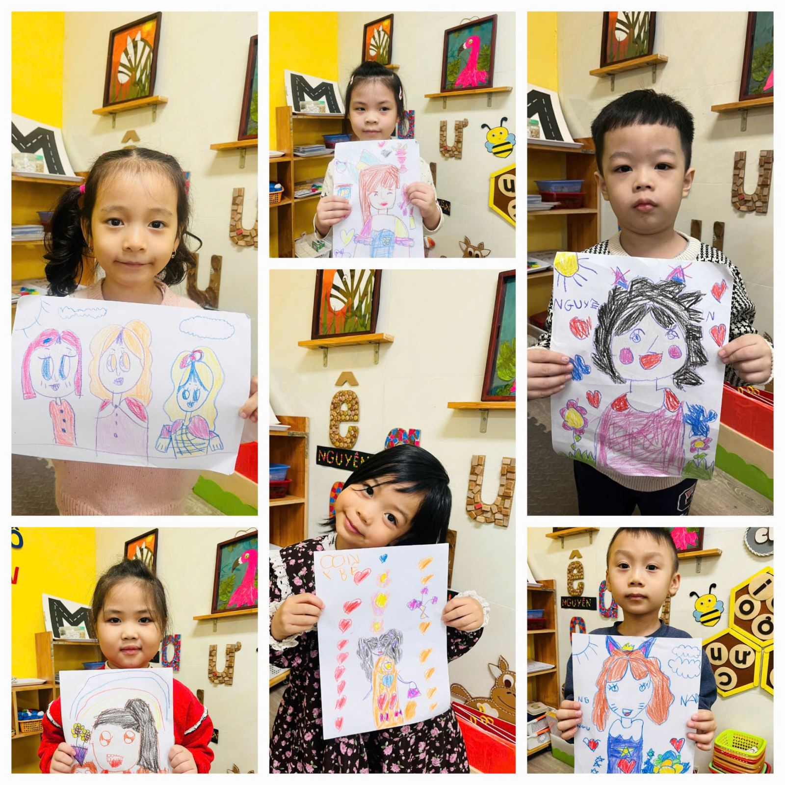 Trong giờ tạo hình, các con chăm chú lựa chọn màu sắc, khéo léo vẽ nên những bức tranh thật đẹp thể hiện hình ảnh cô giáo dịu dàng, nụ cười ấm áp. Không chỉ vậy, các bé còn tự mình sáng tác những câu thơ ngắn gọn, mộc mạc nhưng chan chứa yêu thương, gửi gắm lời cảm ơn đến cô giáo đã luôn tận tâm dạy dỗ các con. Bài thơ đã được AI phổ nhạc rất hay và ý nghĩa. Hoạt động không chỉ giúp trẻ phát huy khả năng sáng tạo mà còn bồi dưỡng cho các con lòng kính trọng, biết ơn cô giáo của mình.