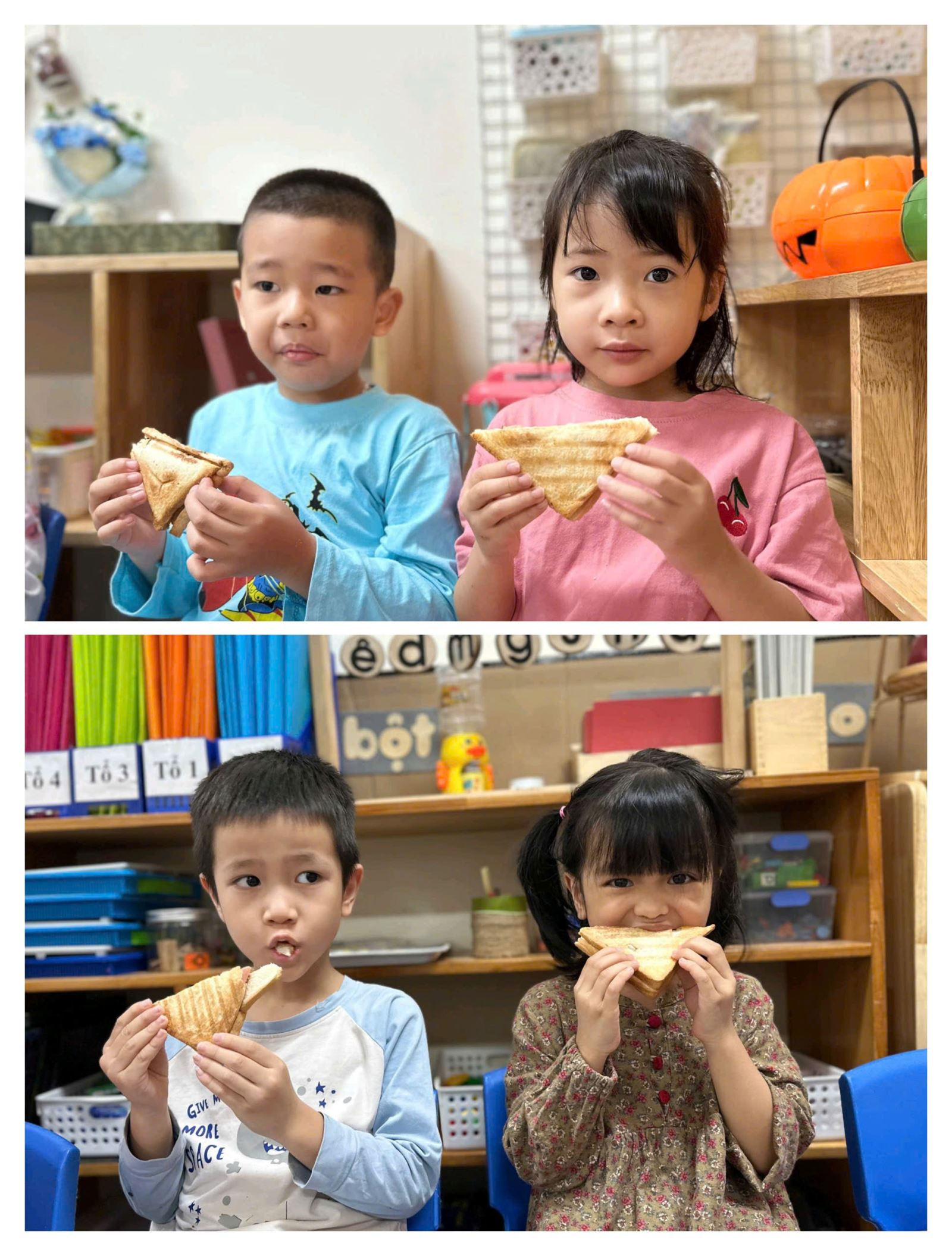 Phát triển kỹ năng vận động tinh: Việc cầm nắm, phết, kẹp giúp tăng cường sự phối hợp giữa tay và mắt, rèn luyện sự khéo léo của đôi bàn tay. Nâng cao ý thức về dinh dưỡng: Các con được tiếp xúc với nhiều loại thực phẩm khác nhau, hiểu được tầm quan trọng của một bữa ăn đầy đủ chất. Khơi dậy sự tự lập và trách nhiệm: Tự tay làm bữa sáng cho mình giúp các con cảm thấy tự hào, tăng cường sự tự tin và ý thức trách nhiệm. Học cách hợp tác và chia sẻ: Trong quá trình thực hiện, các con có cơ hội cùng nhau làm việc, giúp đỡ bạn bè, tạo nên không khí vui vẻ và gắn kết. Phát triển ngôn ngữ và tư duy: Các con được gọi tên các nguyên liệu, chia sẻ cảm nghĩ về món ăn, qua đó mở rộng vốn từ và khả năng diễn đạt.