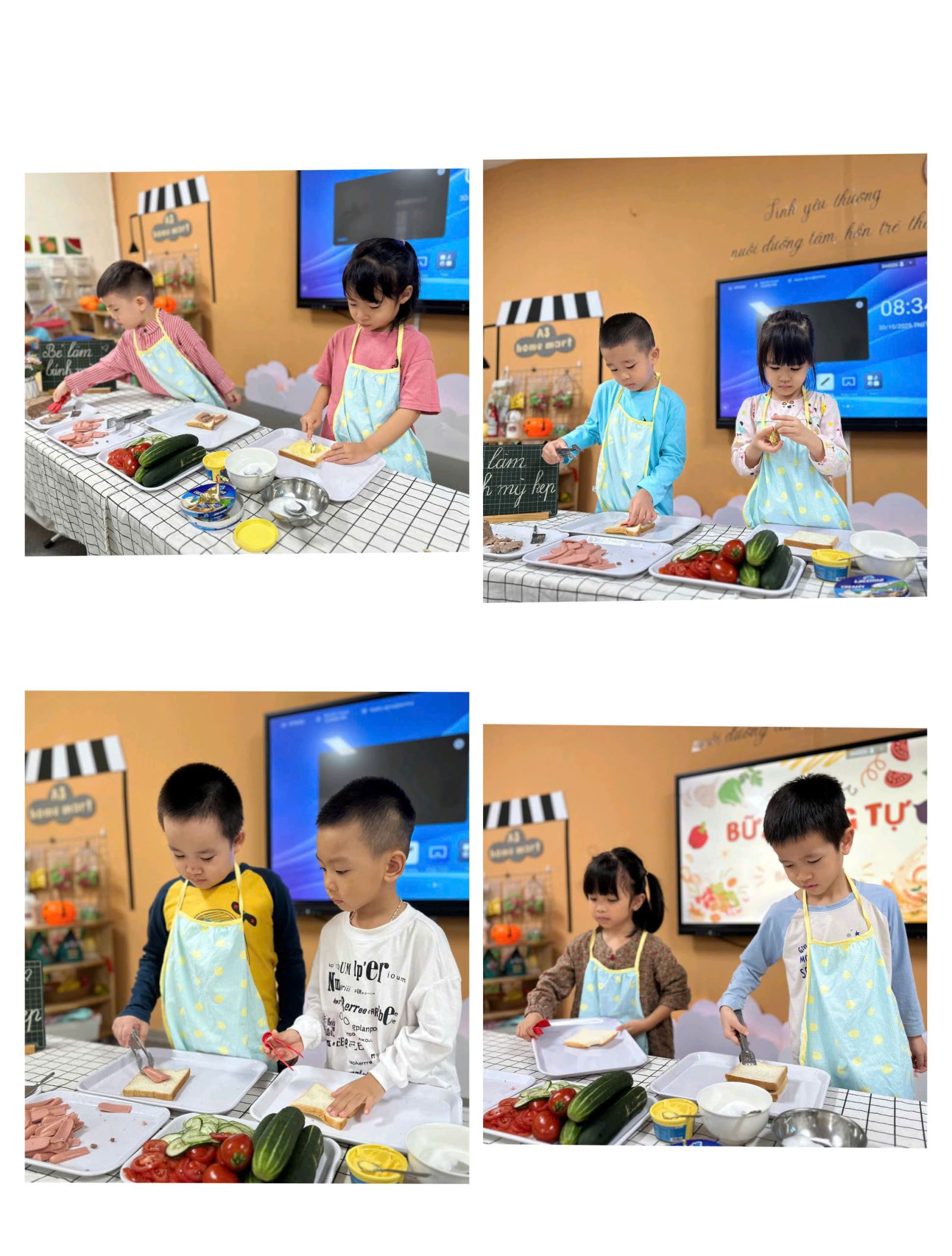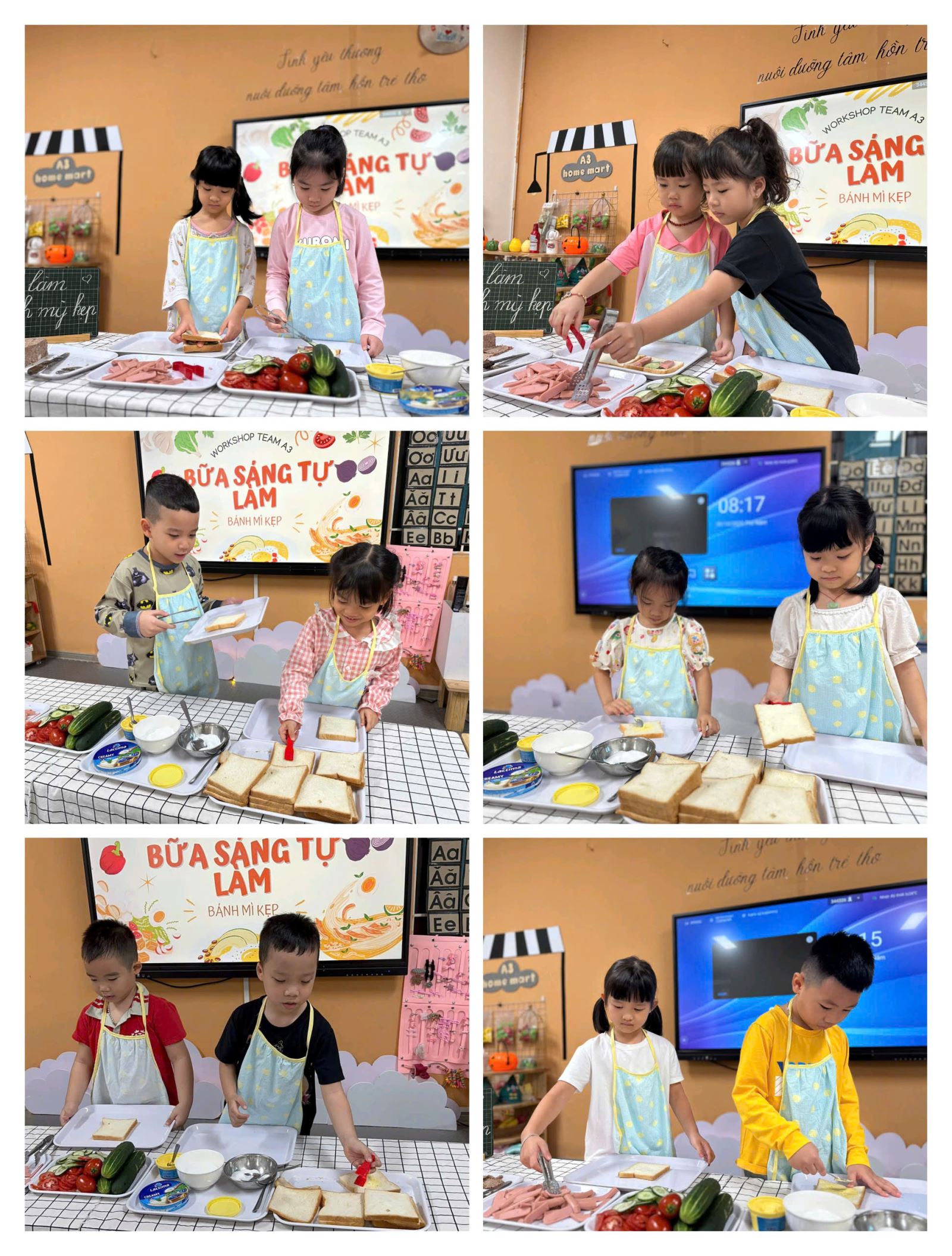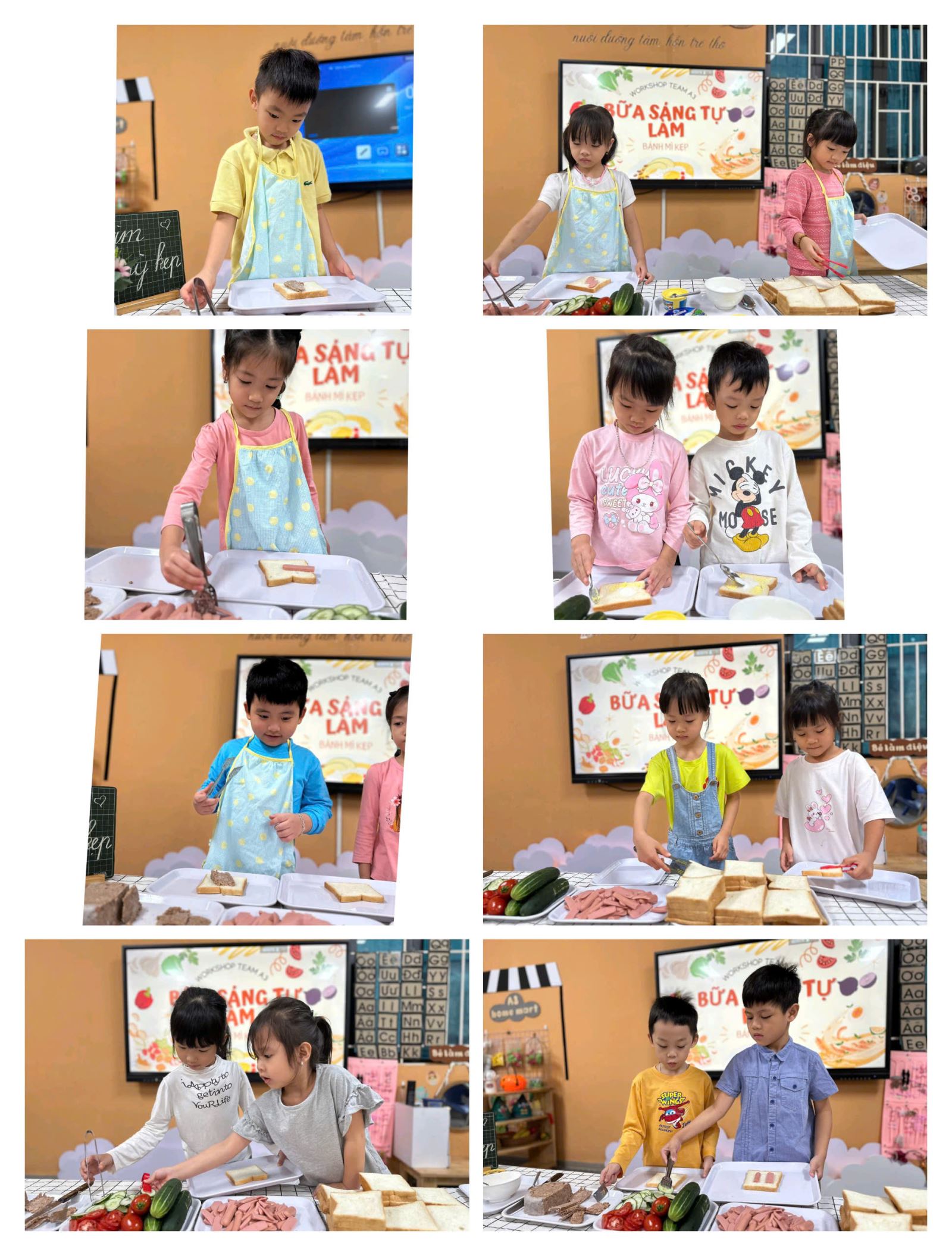 Các con đã hóa thân thành những "đầu bếp tí hon" thực thụ, với chiếc tạp dề xinh xắn và đôi tay thoăn thoắt. Từ việc phết bơ, kẹp xúc xích, pate, phomai, thịt nguội đến việc sắp xếp rau dưa tươi ngon, mỗi bé đều thể hiện sự tập trung và khéo léo đáng kinh ngạc.